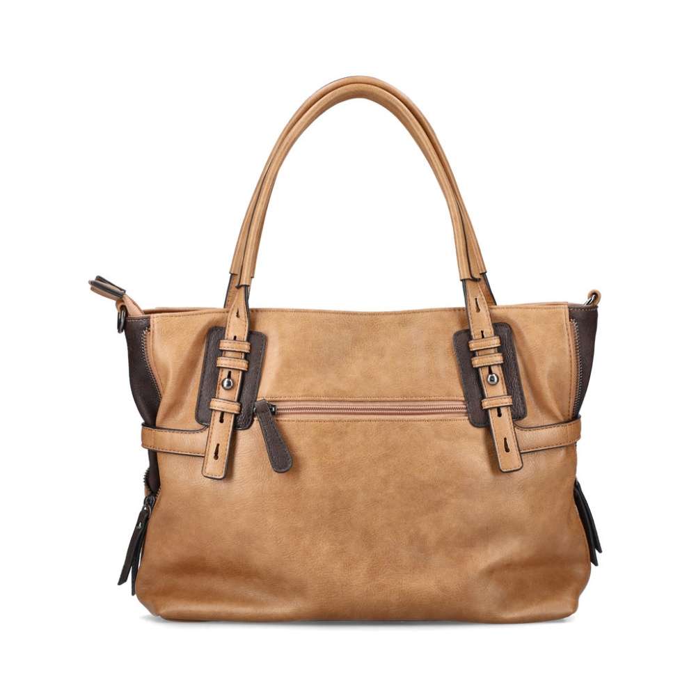 Světle hnědý svršek je na přední straně ozdoben kovovými řetízky, kontrastními tmavě hnědými prvky, vytlačeným logem značky a po stranách zipy, kterými můžete kabelku trošku zvětšit.