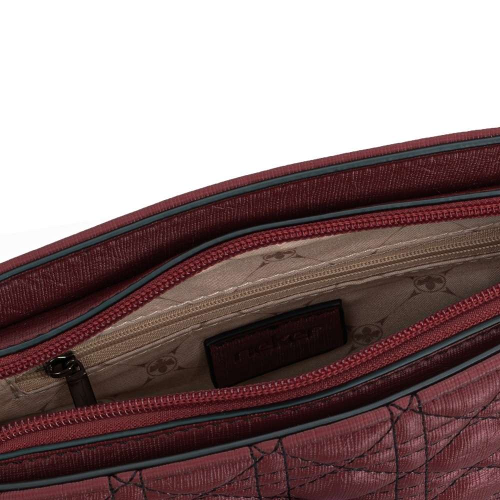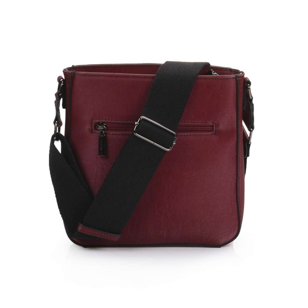 Tato dámská kabelka ve stylu crossbody má svršek v krásné tmavě červené barvě. Vyniká stylovým prošitím černou nití a nápisem z přední strany. Také Vám může přijít vhod malá kapsička pro drobnosti v zadní části.