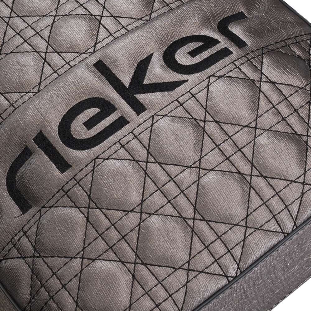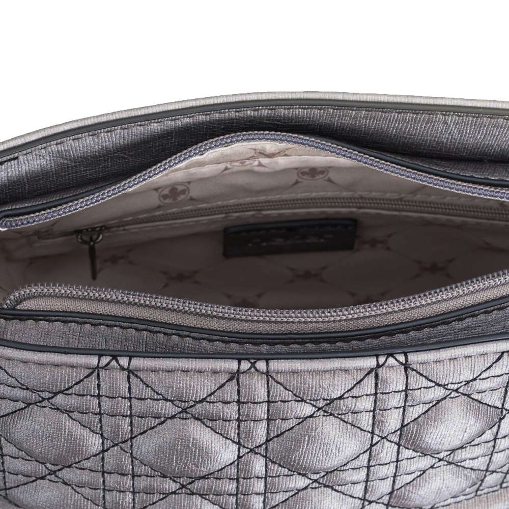 Tato dámská kabelka ve stylu crossbody má svršek v krásné metalické šedé barvě. Vyniká stylovým prošitím černou nití a nápisem z přední strany. Také Vám může přijít vhod malá kapsička pro drobnosti v zadní části.