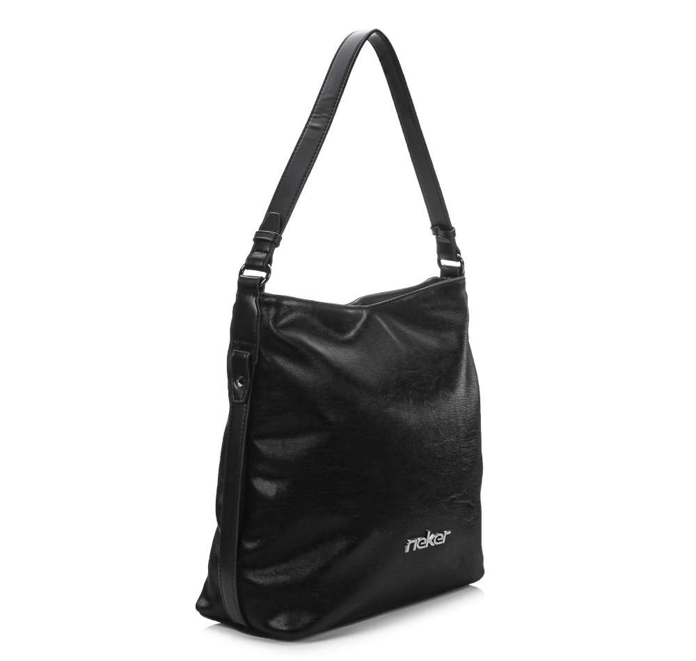 Tato stylová dámská kabelka od značky Rieker má jemně lesklý svršek v černé barvě. Zdobení v podobě černých pásků po bocích a zvrásněný povrch vytváří dokonalý vzhled. Ze zadní strany Vás určitě potěší malá kapsička na drobnosti. Taška je na zip, po jehož rozepnutí se otevřou dvě kapsy, kdy jako dělící prvek je použita kapsa se zipem. Má jedno velké ucho, ale také ramenní popruh, který si můžete připnout a nastavit na Vámi zvolenou délku. Poslouží Vám jako skvělý doplněk do města na nakupování s kamarádkou. Rozměry: cca v 32 cm x š 32 cm Vnitřní uspořádání: kabelka je dělená
