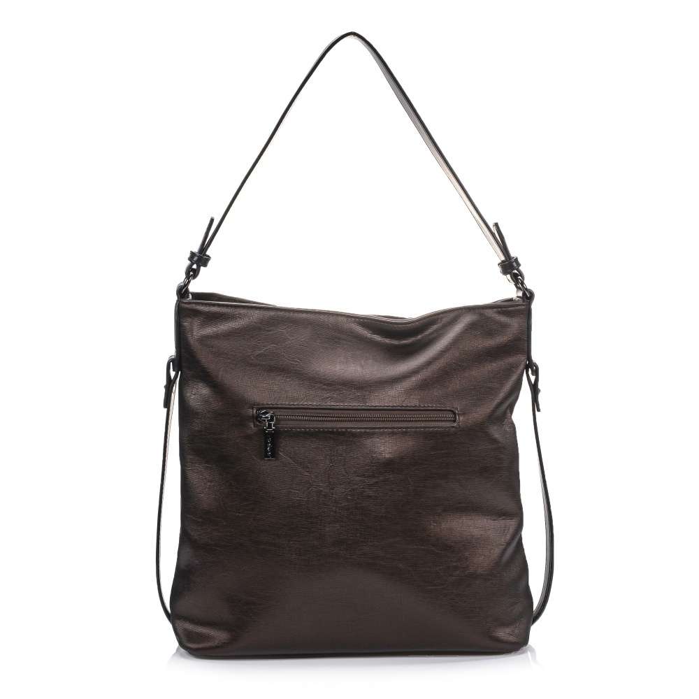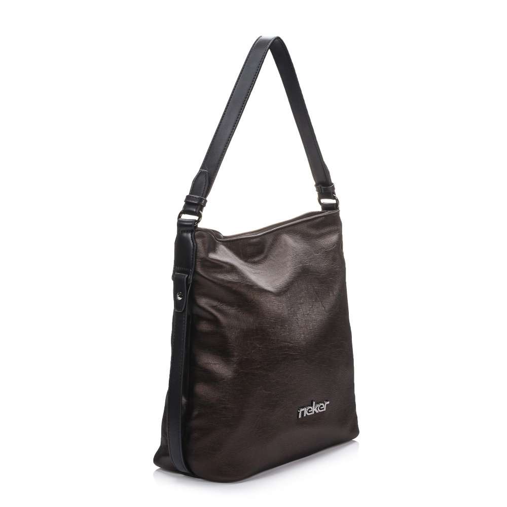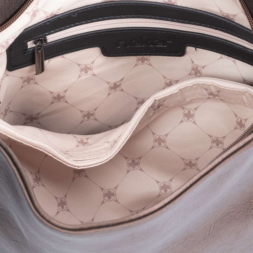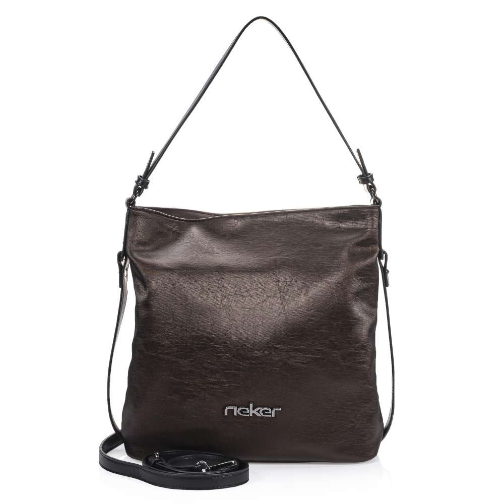 Tato stylová dámská kabelka od značky Rieker má svršek v metalické hnědé barvě. Zdobení v podobě černých pásků po bocích a zvrásněný povrch vytváří dokonalý vzhled. Ze zadní strany Vás určitě potěší malá kapsička na drobnosti. Taška je na zip, po jehož rozepnutí se otevřou dvě kapsy, kdy jako dělící prvek je použita kapsa se zipem. Má jedno velké ucho, ale také ramenní popruh, který si můžete připnout a nastavit na Vámi zvolenou délku. Poslouží Vám jako skvělý doplněk do města na nakupování s kamarádkou. Rozměry: cca v 32 cm x š 32 cm Vnitřní uspořádání: kabelka je dělená Kabelka má délkově nastavitelný popruh, který lze odepnout.