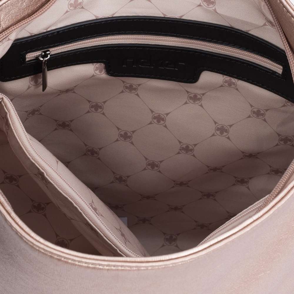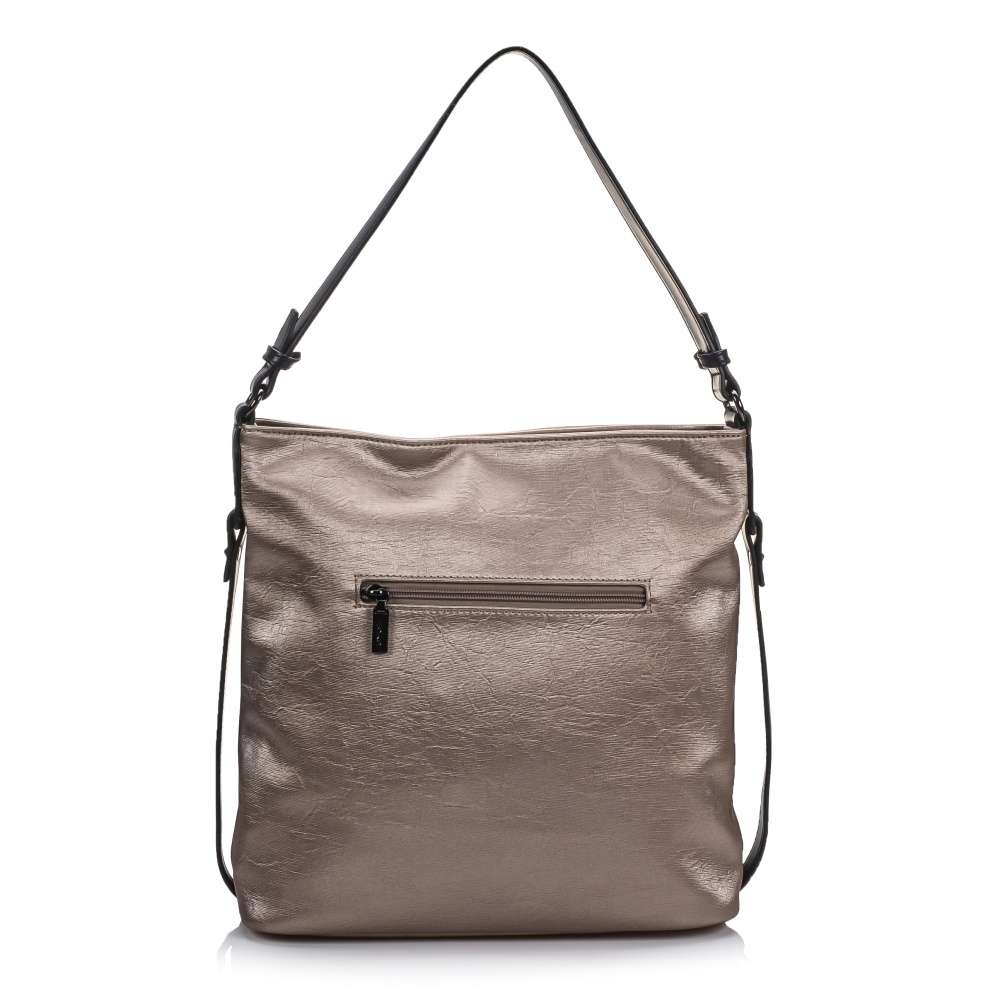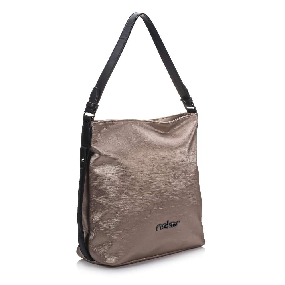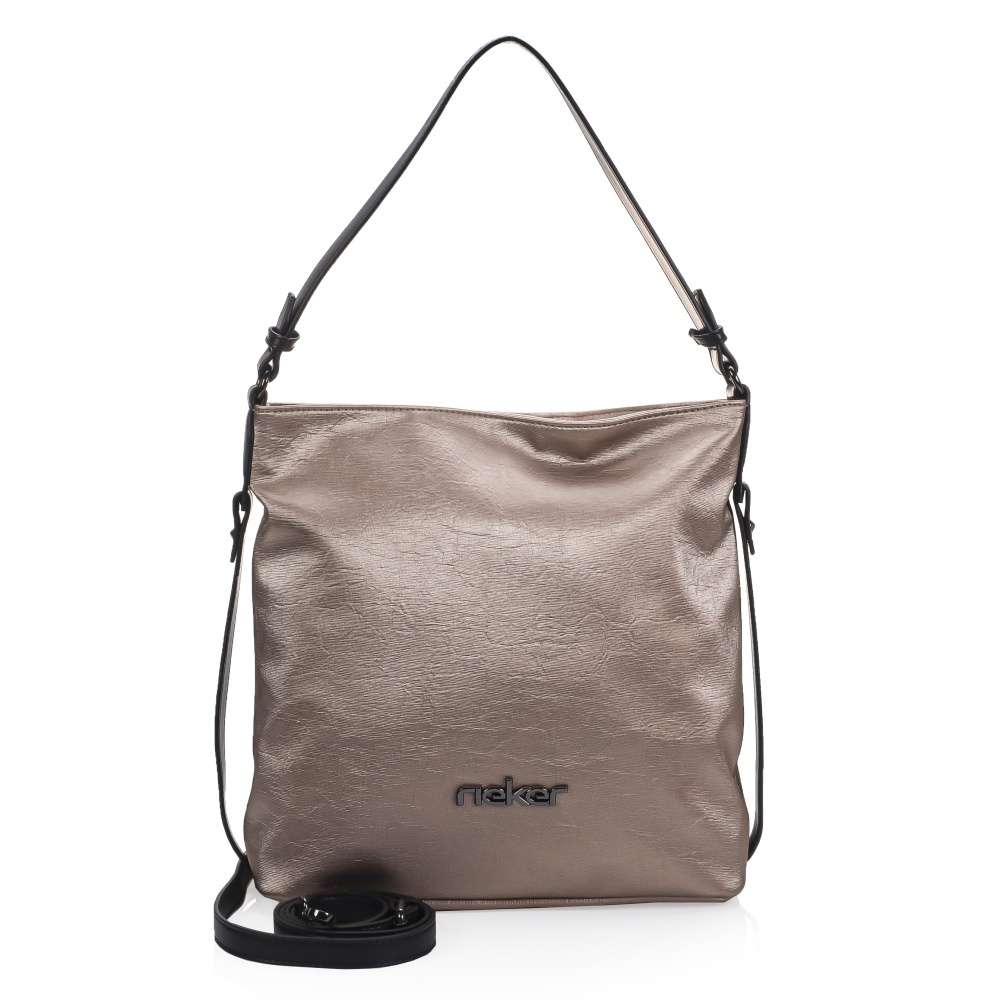 Tato stylová dámská kabelka od značky Rieker má svršek v metalické béžové barvě. Zdobení v podobě černých pásků po bocích a zvrásněný povrch vytváří dokonalý vzhled. Ze zadní strany Vás určitě potěší malá kapsička na drobnosti. Taška je na zip, po jehož rozepnutí se otevřou dvě kapsy, kdy jako dělící prvek je použita kapsa se zipem. Má jedno velké ucho, ale také ramenní popruh, který si můžete připnout a nastavit na Vámi zvolenou délku. Poslouží Vám jako skvělý doplněk do města na nakupování s kamarádkou. Rozměry: cca v 32 cm x š 32 cm Vnitřní uspořádání: kabelka je dělená Kabelka má délkově nastavitelný popruh, který lze odepnout.