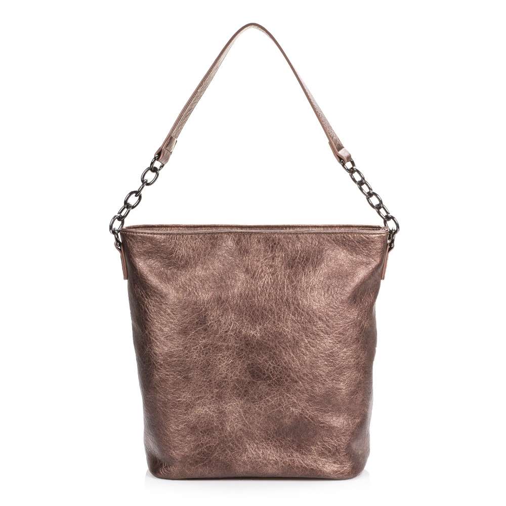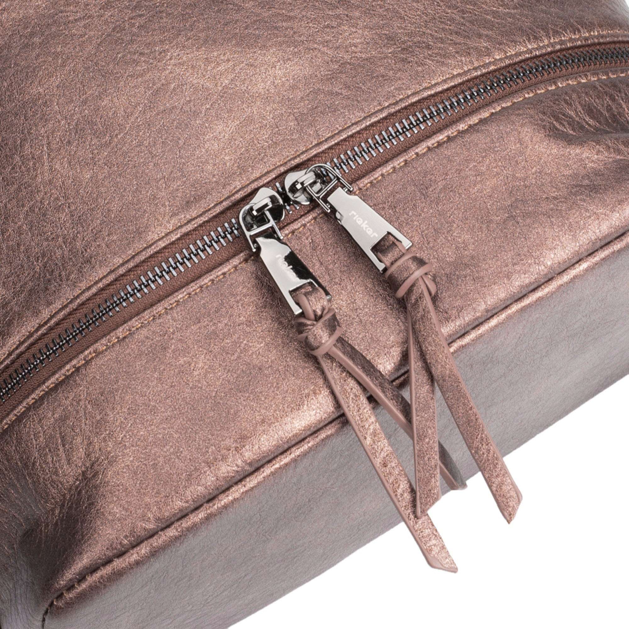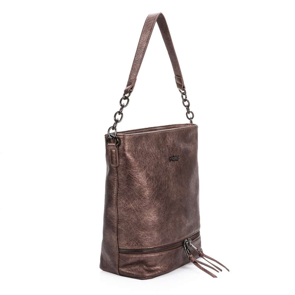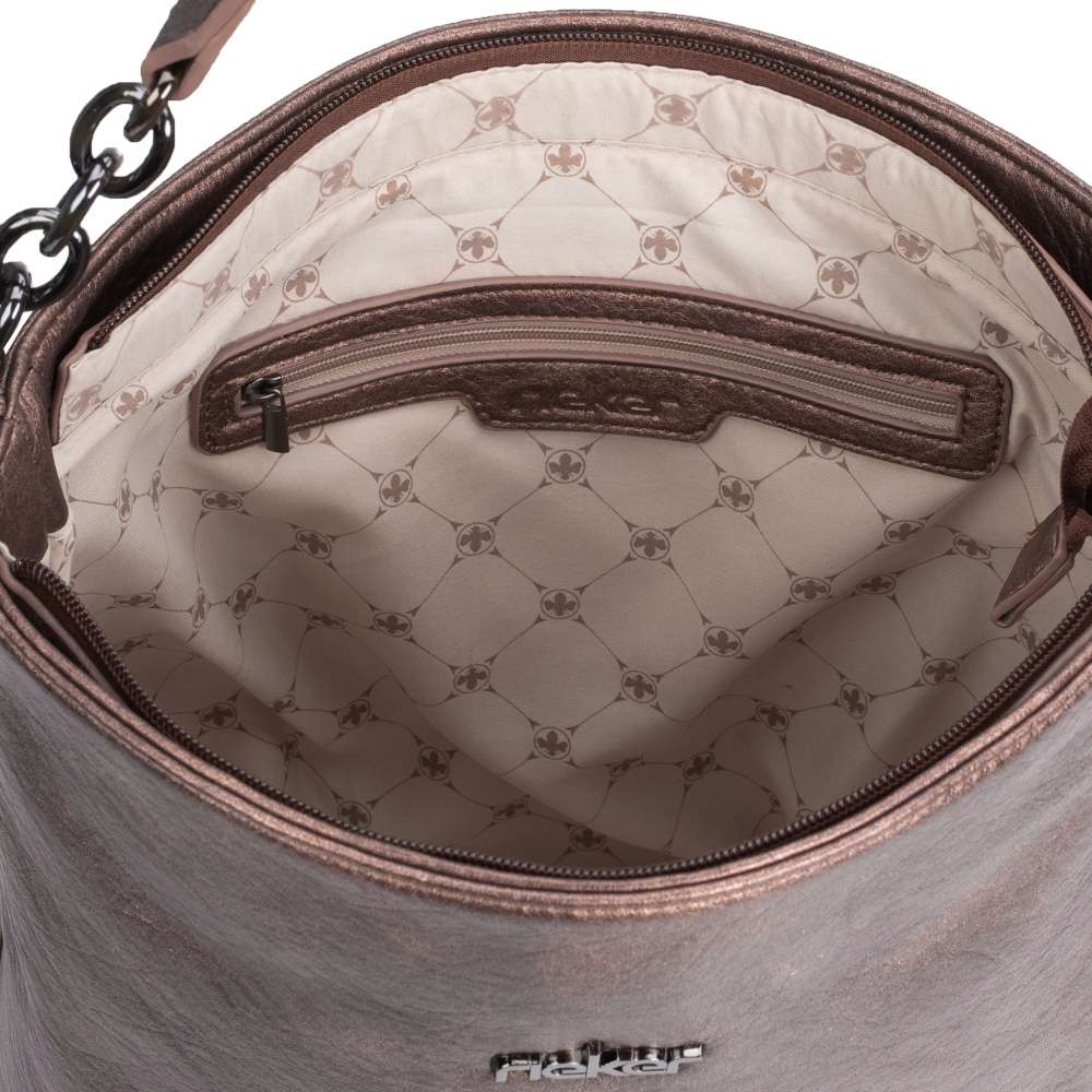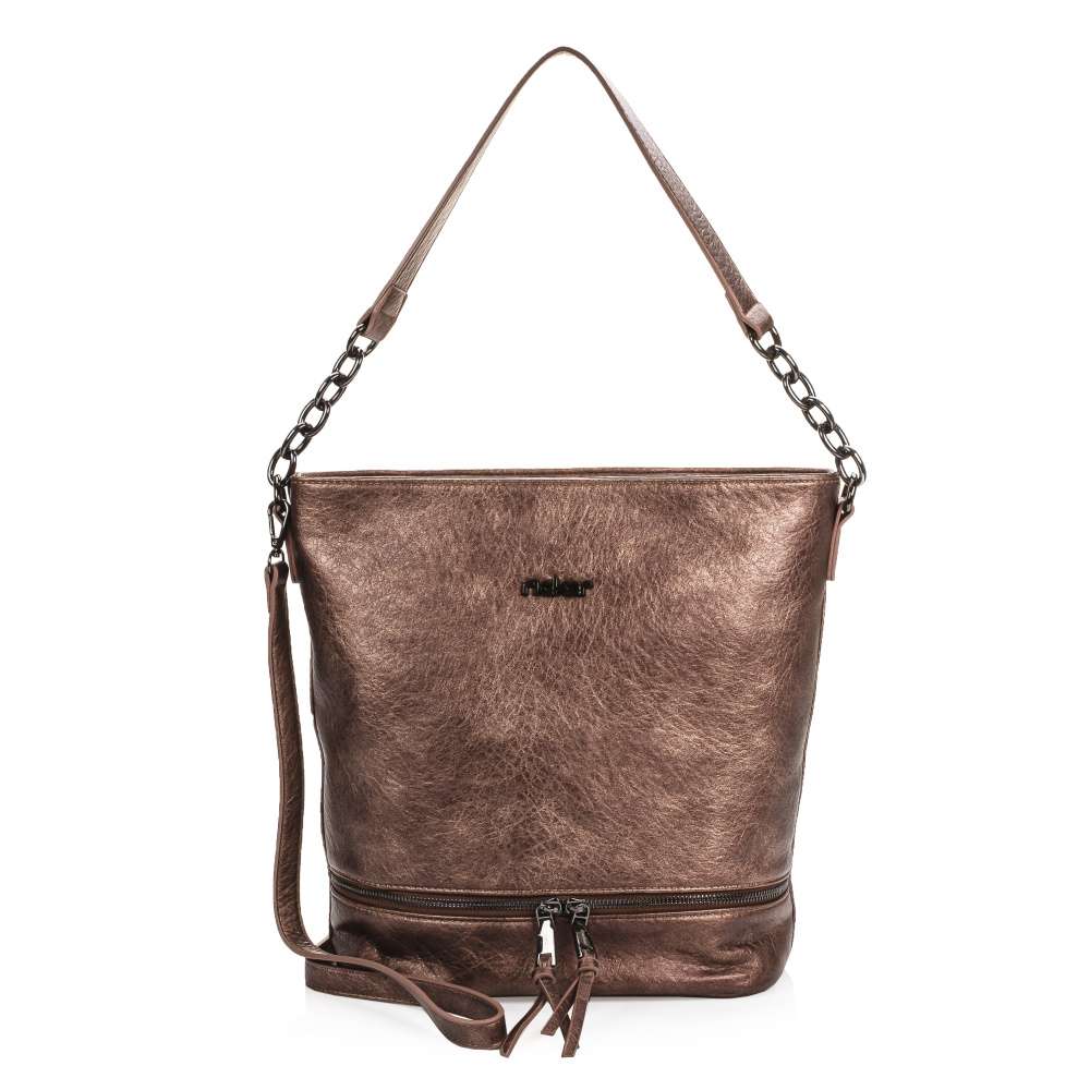 Parádní série dámských kabelek značky Rieker Vás uchvátí. Svršek hnědé barvy s metalickými odlesky je doladěn z přední části nápisem Rieker a funkčním zdobným zipem. Taška je uzavíratelná zipem, po otevření je zde vnitřní kapsa, do které se vejde snad všechno, co potřebujete mít u sebe. Uvnitř se nachází dvě otevřené kapsičky a jedna zapínatelná zipem. Kabelka má dlouhý nastavitelný popruh, pro nošení přes rameno a kratší ucho do ruky. Užijete ji jak při návštěvách kamarádek, tak při nákupech nebo při cestě do práce.