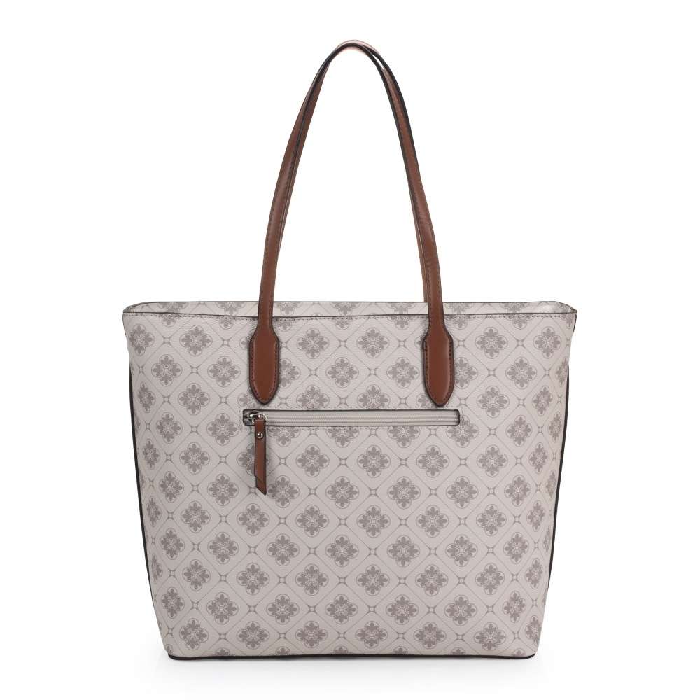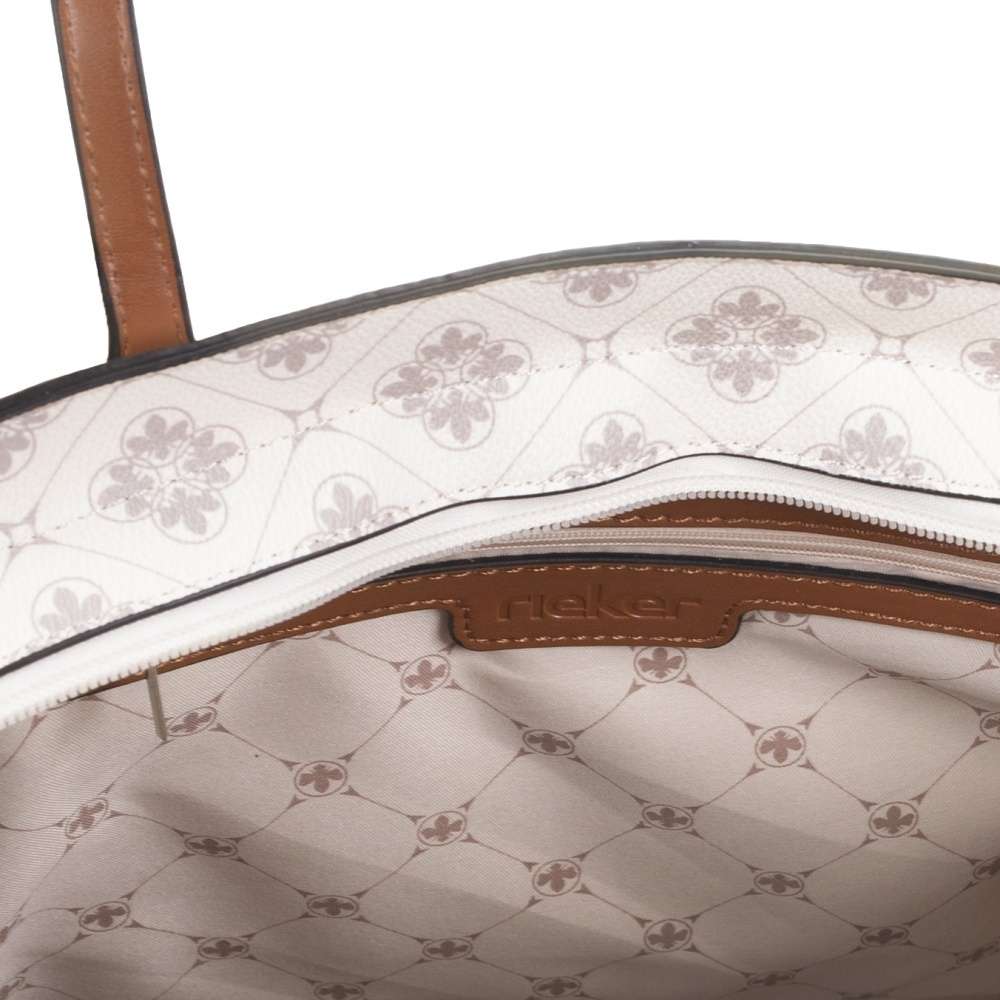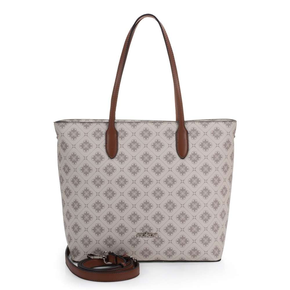 Tato velká dámská kabelka od značky Rieker má svršek z jemně hrubšího materiálu v béžové barvě. Na první pohled Vás zaujme svým kontrastním elegantním vzorem a hnědými detaily. Ze zadní strany Vás určitě potěší malá kapsička sloužící k uložení různých drobnosti. Uzavírá se zipem, po jehož rozepnutí se Vám nabízí několik dalších kapes například na mobil nebo klíče. Má dvě ucha, ale také ramenní popruh, který si můžete nastavit na Vámi zvolenou délku či jej odepnout. Poslouží Vám jako skvělý doplněk do města na nakupování s kamarádkou. Rozměry: cca v 29 cm x š 39 cm Vnitřní uspořádání: kabelka není dělená Kabelka má délkově nastavitelný popruh, který lze odepnout.