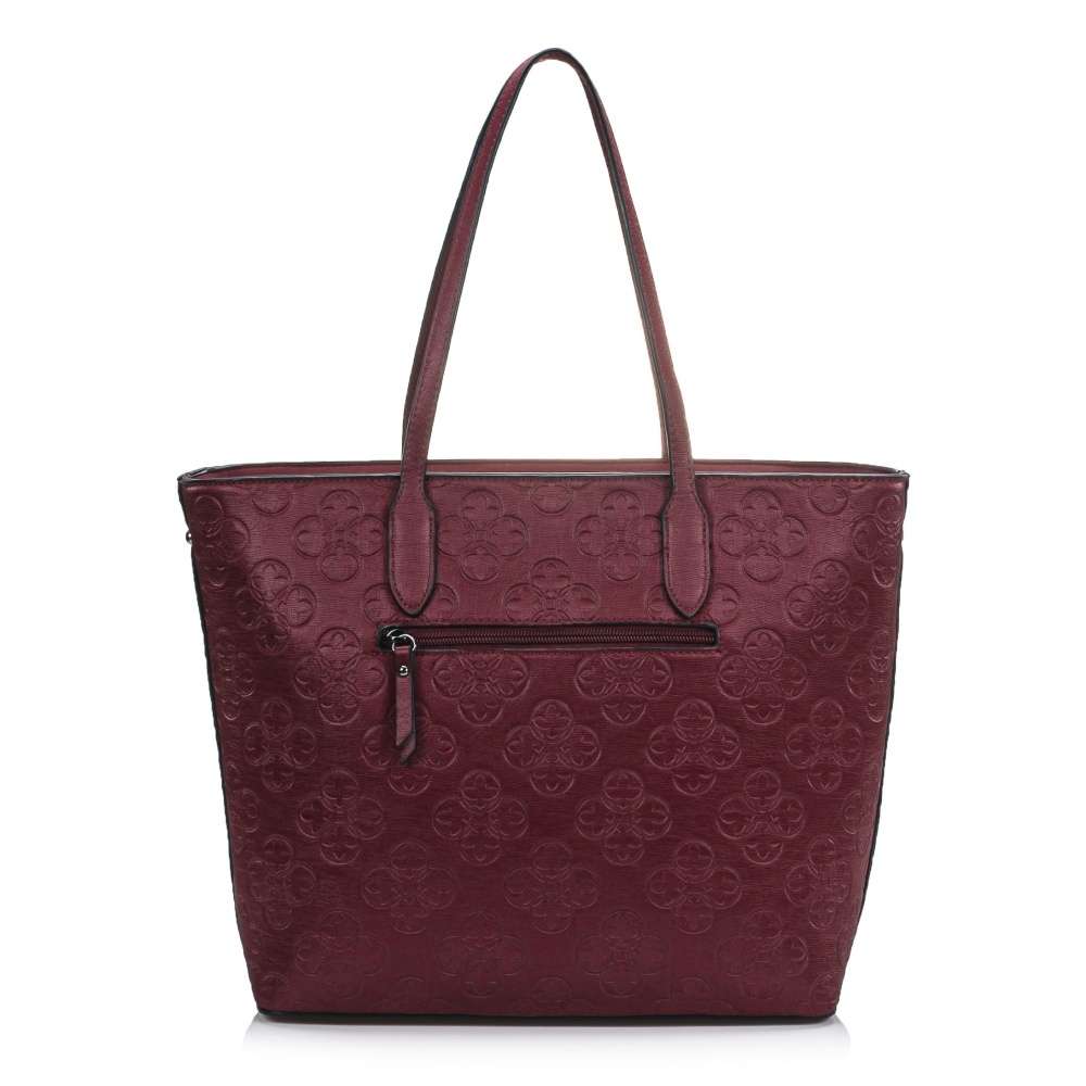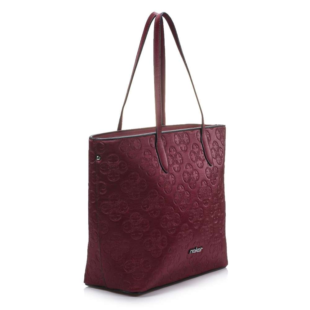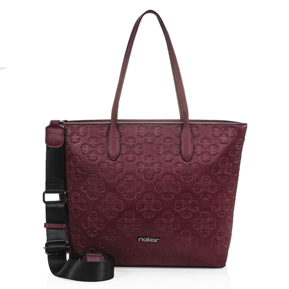 Tato velká dámská kabelka od značky Rieker je výjimečná svým svrškem v metalické červené barvě. Dokonalý vzhled dotváří vzor vytlačený po celé ploše kabelky. Ze zadní strany Vás jistě potěší malá kapsička pro drobnosti. Taška se uzavírá zipem, po jehož rozepnutí naleznete několik dalších kapes například pro Váš mobil a klíče. Má dvě ucha, ale také širší ramenní popruh, který si můžete nastavit na Vámi zvolenou délku či jej odepnout. Poslouží Vám jako skvělý doplněk do města na nakupování s kamarádkou. Rozměry: cca v 29 cm x š 39 cm Vnitřní uspořádání: kabelka není dělená Kabelka má délkově nastavitelný popruh, který lze odepnout.