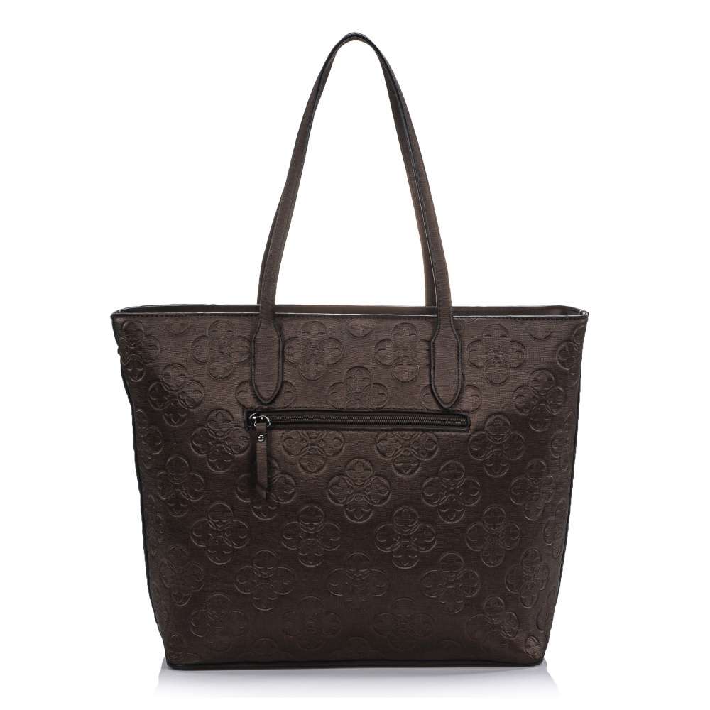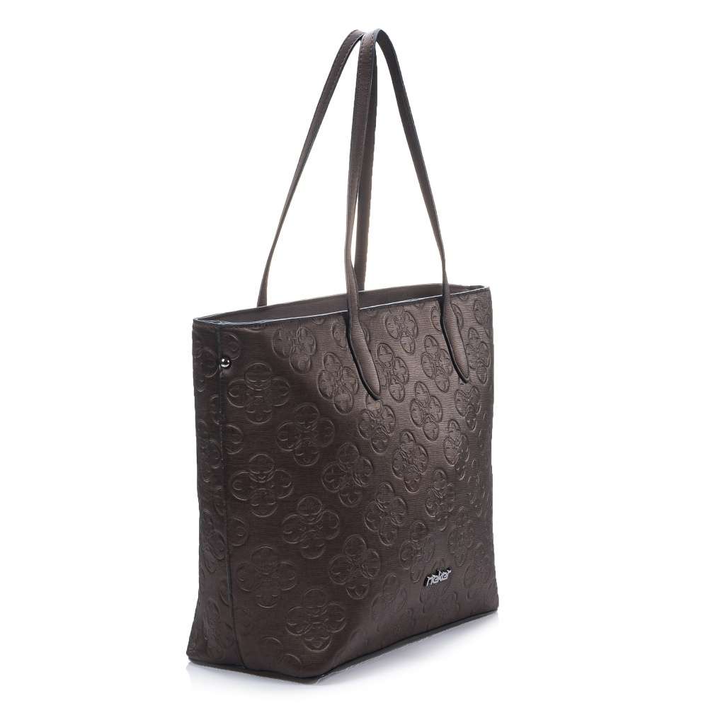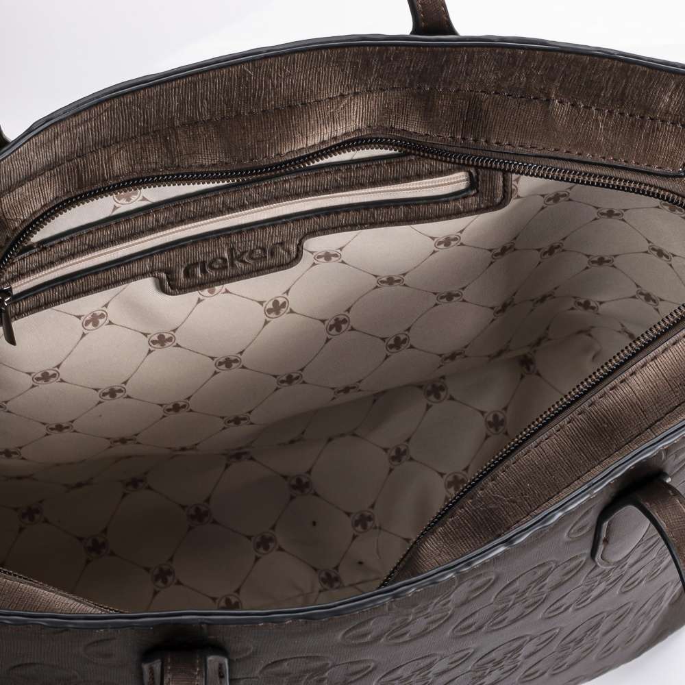 Tato velká dámská kabelka od značky Rieker je výjimečná svým svrškem v metalické hnědé barvě. Dokonalý vzhled dotváří vzor vytlačený po celé ploše kabelky. Ze zadní strany Vás jistě potěší malá kapsička pro drobnosti. Taška se uzavírá zipem, po jehož rozepnutí naleznete několik dalších kapes například pro Váš mobil a klíče. Má dvě ucha, ale také širší ramenní popruh, který si můžete nastavit na Vámi zvolenou délku či jej odepnout. Poslouží Vám jako skvělý doplněk do města na nakupování s kamarádkou. Rozměry: cca v 29 cm x š 39 cm Vnitřní uspořádání: kabelka není dělená Kabelka má délkově nastavitelný popruh, který lze odepnout.