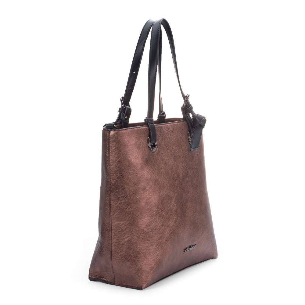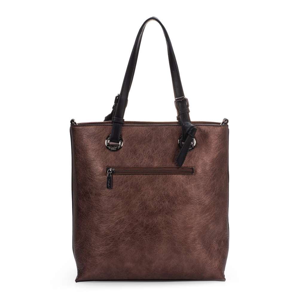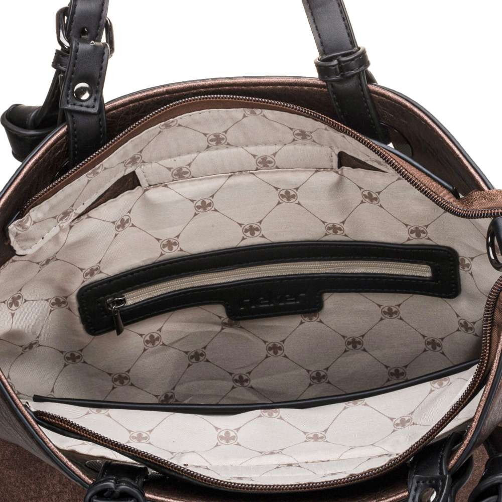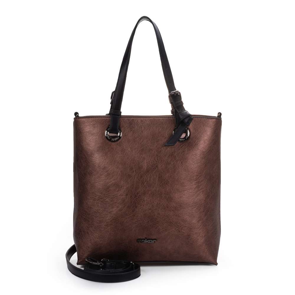 Tato dámská kabelka v metalické hnědé barvě od značky Rieker zaujme především svrškem vyrobeným z příjemného materiálu. Zdobným prvkem jsou zde také kovové kroužky s provlečenými uchy z černého odstínu. Ze zadní strany Vás určitě potěší malá kapsička sloužící k uložení různých drobnosti. Uzavírá se zipem, po jehož rozepnutí se Vám nabízí několik dalších kapes například na mobil nebo klíče. Má dvě ucha, ale také ramenní popruh, který si můžete nastavit na Vámi zvolenou délku či jej odepnout. Krásně doplní Vaše outfity, proto neváhejte, a dopřejte si tento skvělý kousek. Rozměry: cca v 33 cm x š 40 cm Vnitřní uspořádání: kabelka není dělená Kabelka má délkově nastavitelný popruh, který lze odepnout.