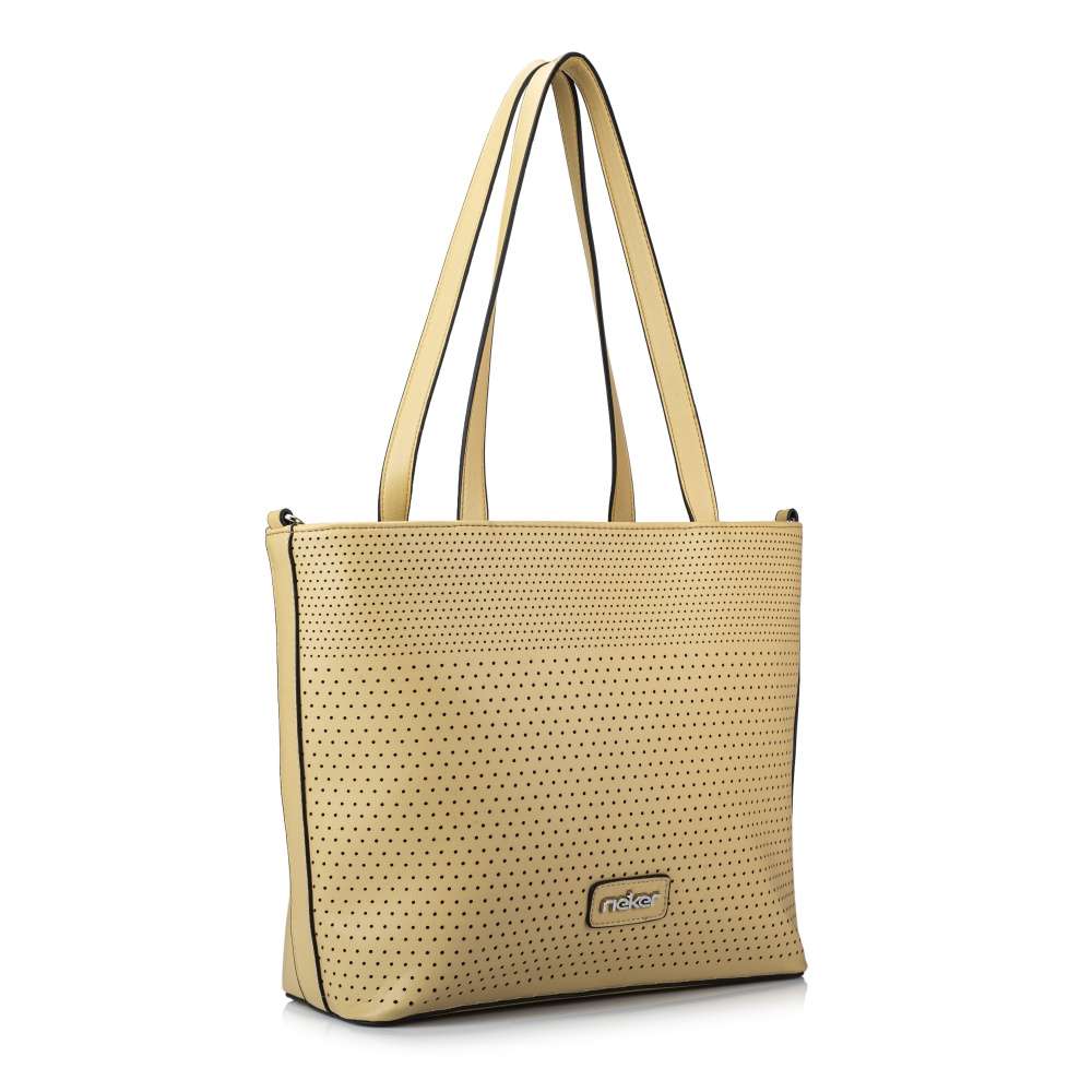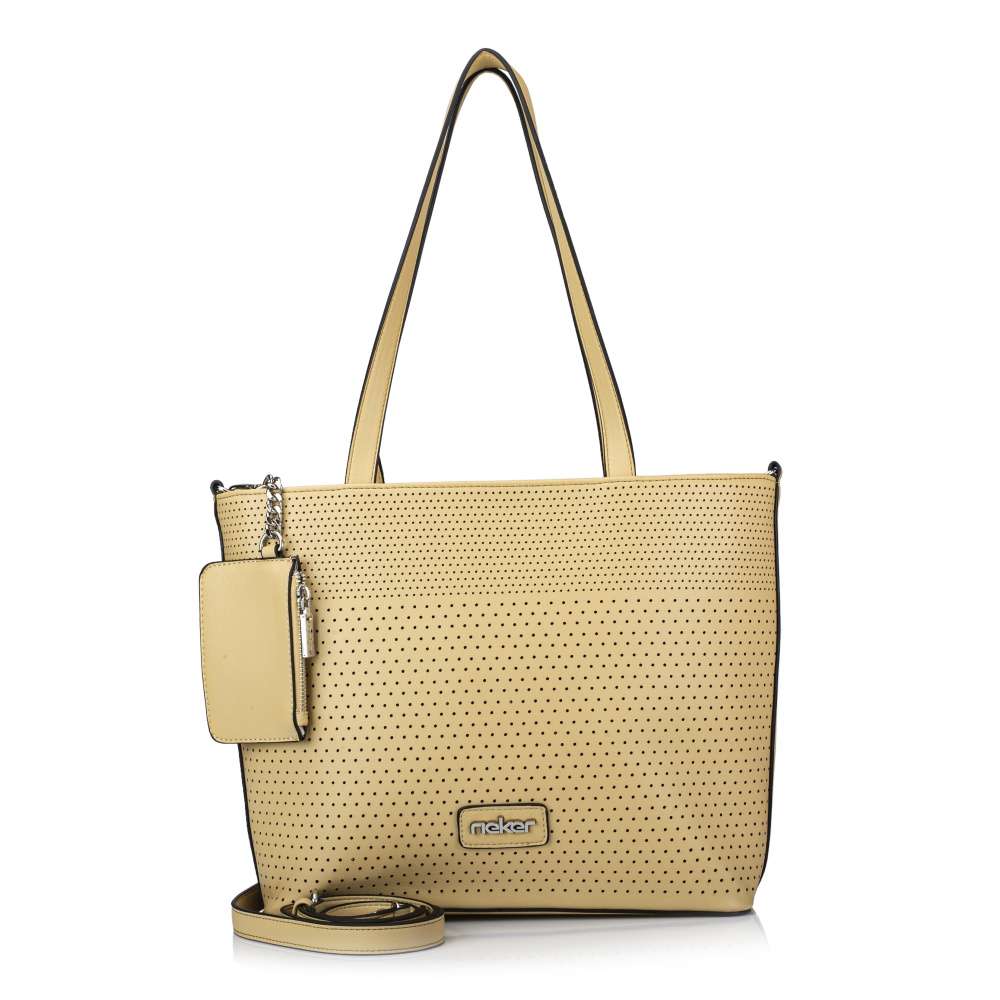 Dámská kabelka značky RIEKER, jenž bude vhodná na každodenní nošení. Hladký svršek má na sobě malé designové dírky a logo značky. Spolu s malou taštičkou, která může sloužit jako ozdoba nebo klíčenka uvnitř kapsy, je tento model vhodným adeptem do Vašeho nákupního košíku. Vevnitř velké kapsy uvidíme kapsičku na zip, a z druhé strany další dvě otevřené kapsičky na mobil nebo doklady. Ke kabelce je přidán i dlouhý popruh. Model můžete vzít s sebou na pracovní příležitosti, nebo do města na nákupy. Rozměry: cca V 28 cm x Š 35 cm Vnitřní uspořádání: Kabelka není dělená Kabelka má délkově nastavitelný popruh, který lze odepnout.