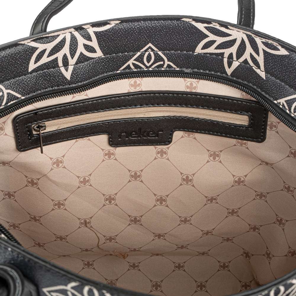 Detailní informace Líbivá dámská kabelka značky RIEKER, jenž bude Vaší každodenní společnicí. Svršek má na sobě ozdobné vzory a logo značky. Na uchu je ozdoba, kterou můžete kdykoliv sundat. Taška má na zadní straně menší kapsu, do které můžete dát svoje drobnosti. Po otevření velké kapsy je dost prostoru pro větší předměty, třeba pro knížku, nebo menší kapsičky po stranách, kde můžete dát doklady, nebo sluneční brýle. K modelu je přidán popruh přes rameno pro pohodlné nošení.