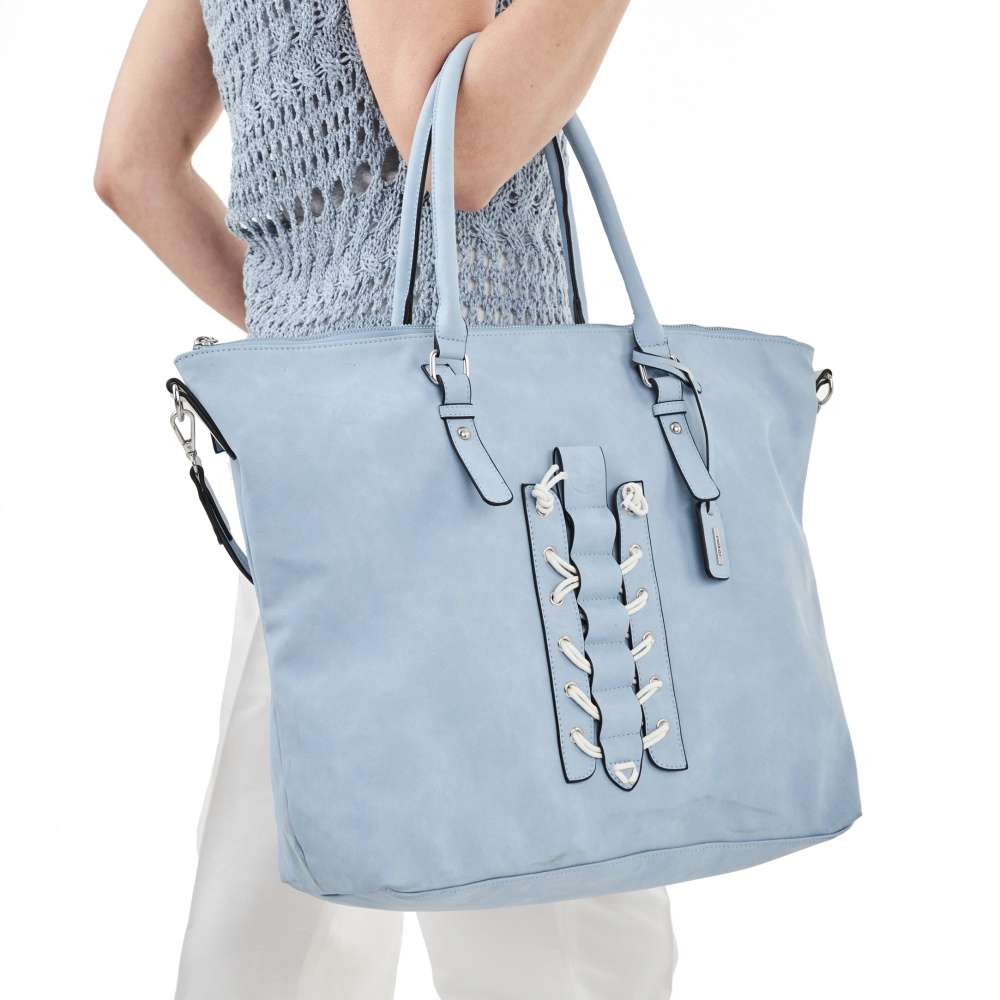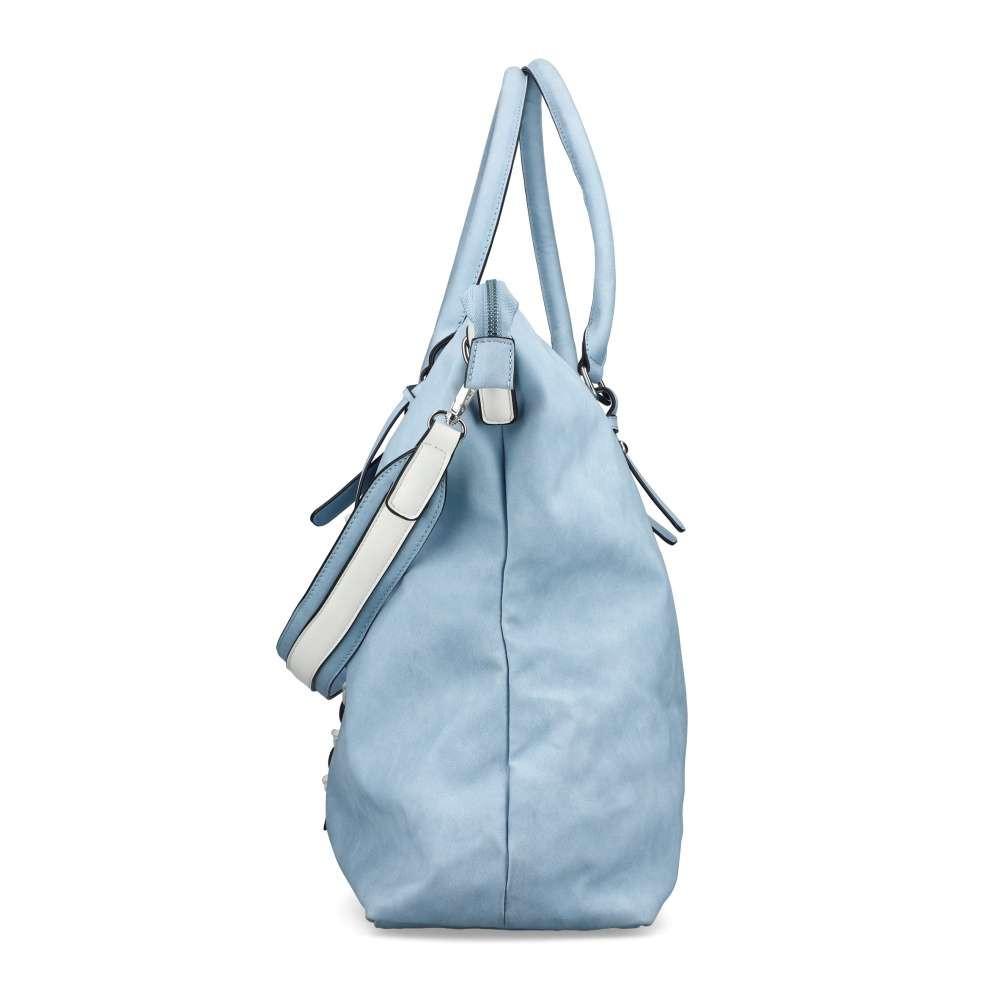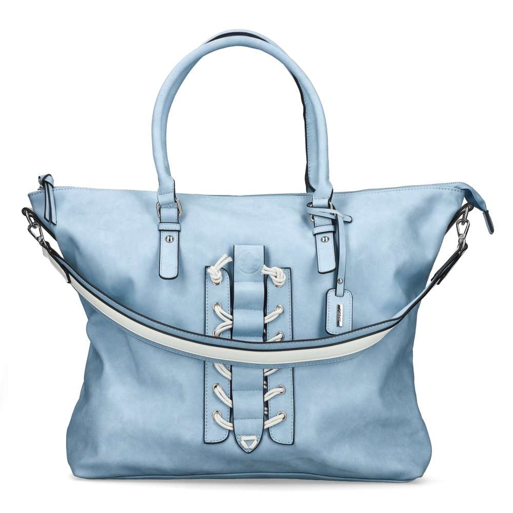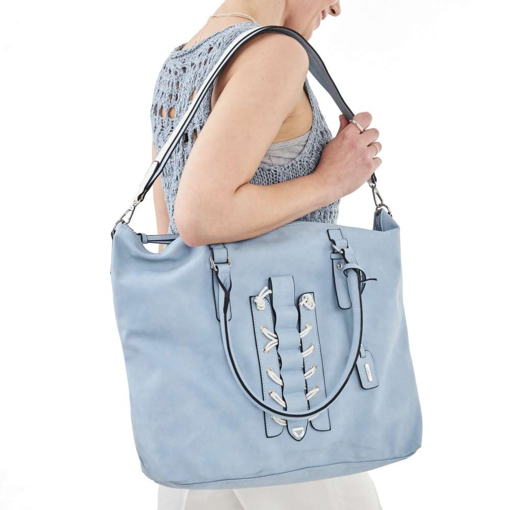 Dámská kabelka značky Rieker modré barvy zdobená originální aplikací přední části a ozdobným přívěskem. Hlavní úložný prostor je uzavíratelný na zip, po jeho rozepnutí uvnitř najdeme dvě malé kapsičky. Tento model je vybaven dvěma pevnými popruhy pro nošení v ruce a jedním delším popruhem, který lze odepnout. Tato kabelka bude vhodná do práce nebo na kávu s přáteli. Rozměry cca: V 28,5 cm x Š 39 cm Vnitřní uspořádání: kabelka není dělená. Kabelka má délkově nastavitelný popruh, který lze odepnout.