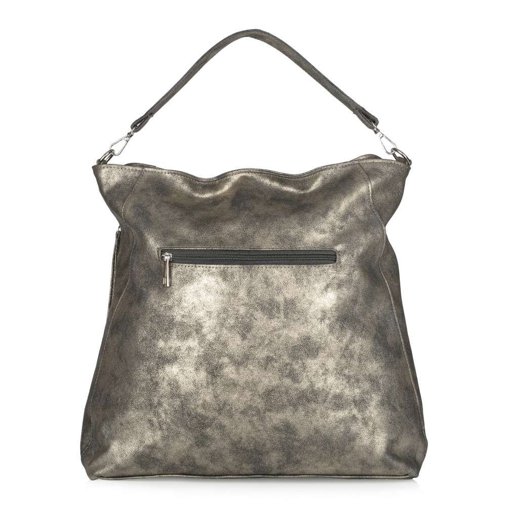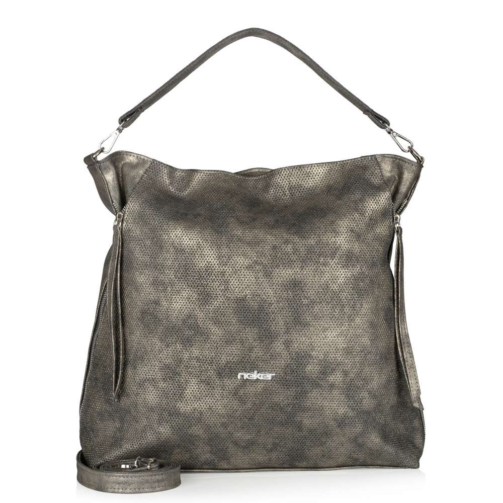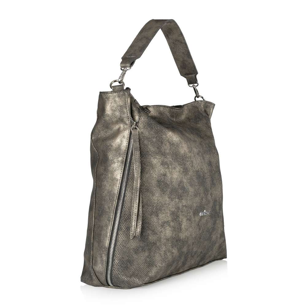 Stylová dámská kabelka značky RIEKER na každodenní nošení. Svršek s metalickými odlesky má na sobě logo značky a zipy po stranách, které slouží jak na ozdobu, tak pro zvětšení místa v kabelce. Z vrchní strany je hlavní prostorná kapsa, ve které jsou další dvě menší kapsy, jedna na zip a druhá bez zavírání. Na zadní straně je taktéž malá kapsička, přímo na Vaše drobnosti nebo například klíče. Tento model nesmí chybět ve Vašem šatníku. Rozměry: cca V 36 cm x Š 35 cm Vnitřní uspořádání: Kabelka není dělená. Kabelka má délkově nastavitelný popruh, který lze odepnout.
