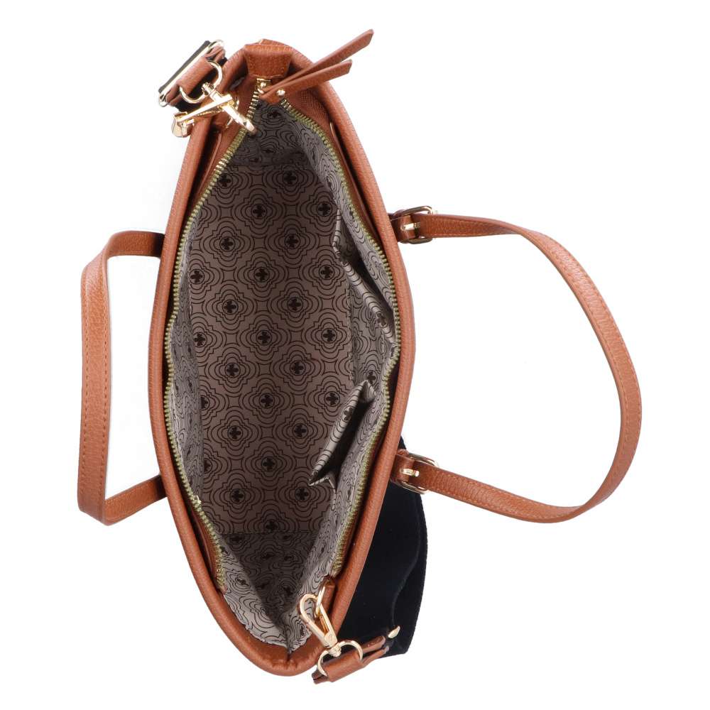 Tato menší černá kabelka značky RIEKER s hnědým lemem je skutečným módním skvostem, který zdůrazní váš osobní styl a zároveň splní vaše požadavky na organizaci a praktičnost. Zlaté aplikace na kabelce dodávají jemný nádech luxusu a zvýrazňují eleganci celého produktu. Jedním z nejzajímavějších prvků této kabelky je přiložená peněženka s jedinečným potiskem. Tato peněženka nejenže perfektně ladí s kabelkou, ale zároveň zajišťuje bezpečné uložení vašich peněz. Hlavní část kabelky obsahuje menší kapsičky, které vám umožní pečlivě uspořádat všechny vaše nezbytnosti a udržet je na dosah ruky. Díky délkově nastavitelnému popruhu si kabelku jednoduše uzpůsobíte podle sebe. Bez ohledu na to, kam vyrazíte, tato kabelka bude vždy stát za pozornost a bude váš dokonalý doplněk. Rozměry: cca v 23 cm x š 34 cm Vnitřní uspořádání: Kabelka není dělená. Kabelka má délkově nastavitelný popruh. Maximální délka nastavitelného popruhu je cca 120 cm.
