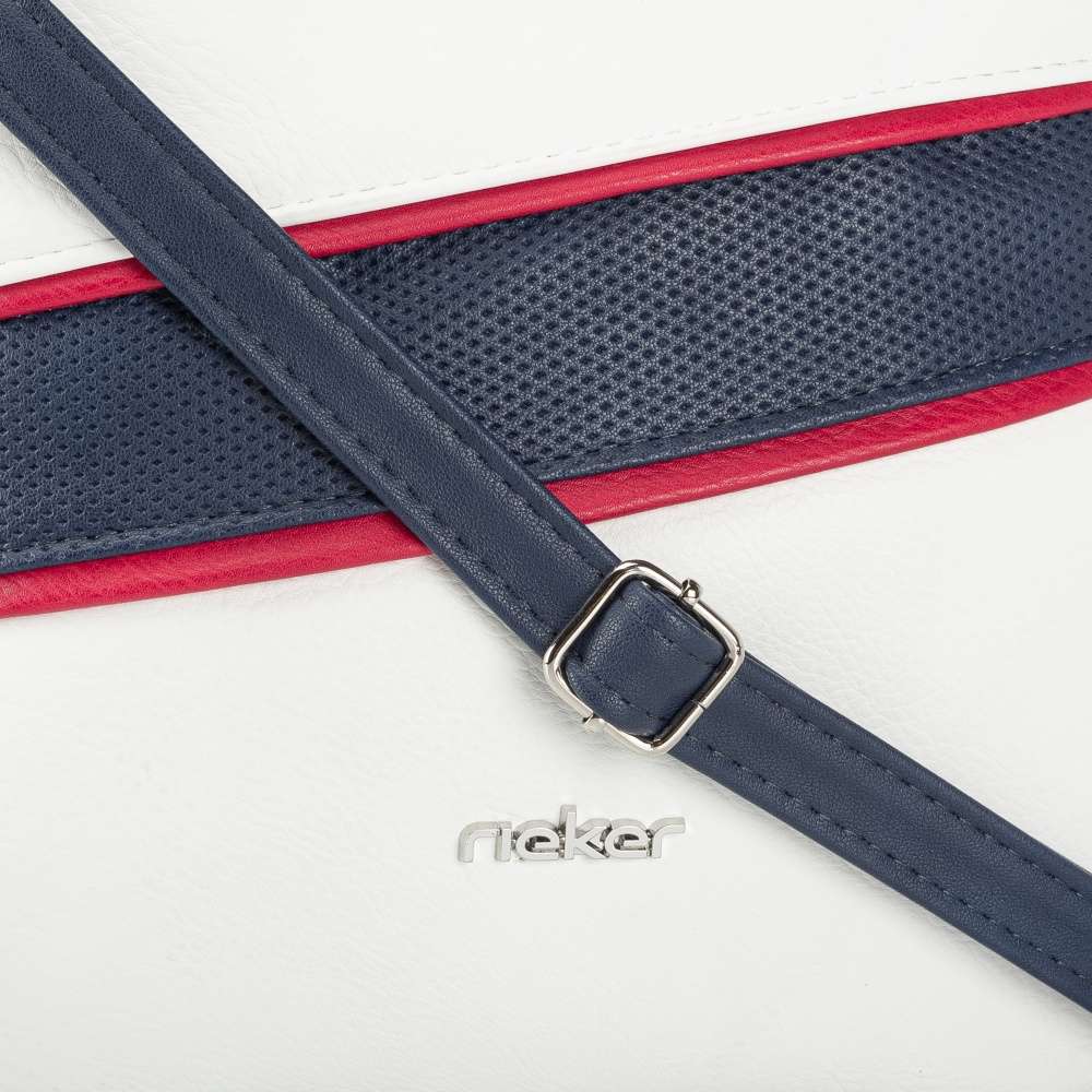 Detailní informace Kombinace bílé, modré a červené vytváří nepřehlédnutelný vzhled této kabelky značky Rieker a jistě potěší nejednu ženu, která se ráda cítí výjimečně. Logo značky na přední straně dozdobí celkový vzhled. Na zadní straně se nachází menší kapsa na drobnosti. Do hlavní kapsy se dostanete pomocí zipu na horním kraji, po jehož otevření se dostanete do vnitřní části, zde se nacházejí dvě malé kapsy. Do města či na schůzku s přáteli bude tento model pro Vás volbou číslo jedna.