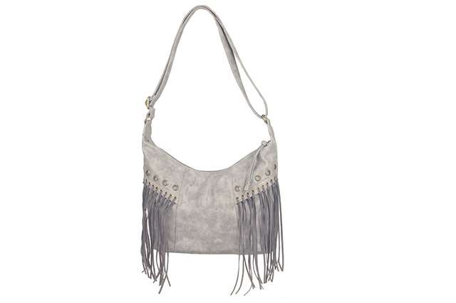 Svršek kabelky je vyroben ze syntetického materiálu v šedé barvě. Svršek je dozdoben kovovými kulatými oky, která jsou ve zlatavé barvě a dále pak hnědo-šedými třásněmi po stranách tašky.