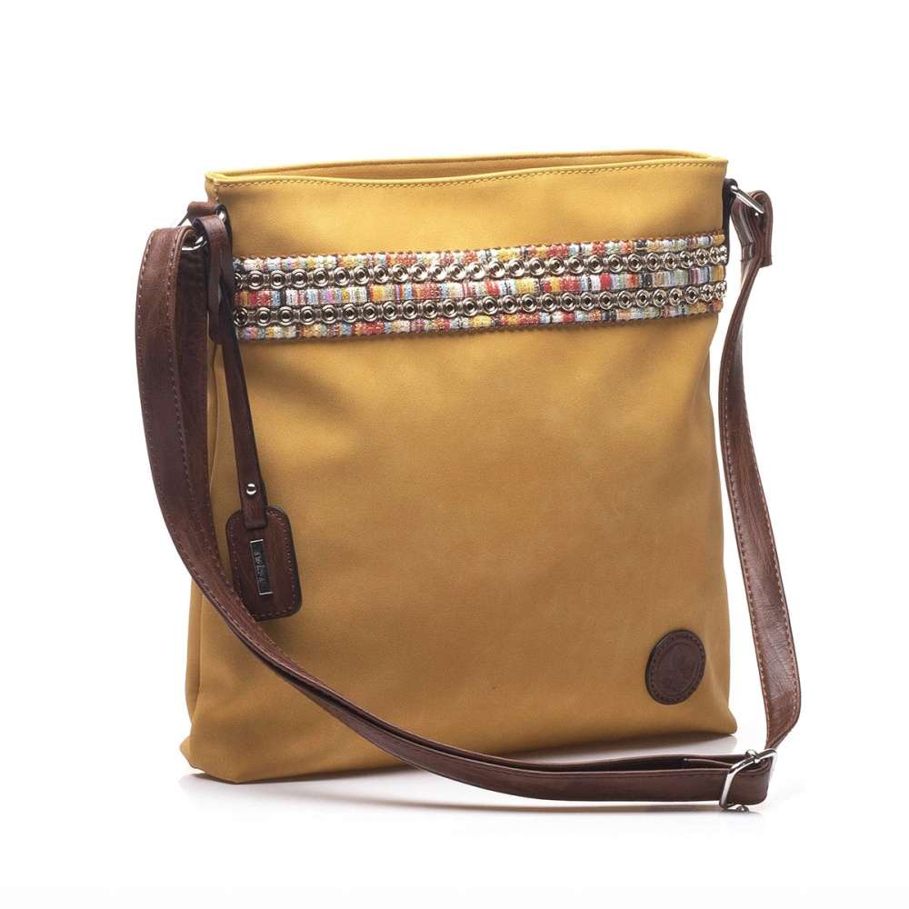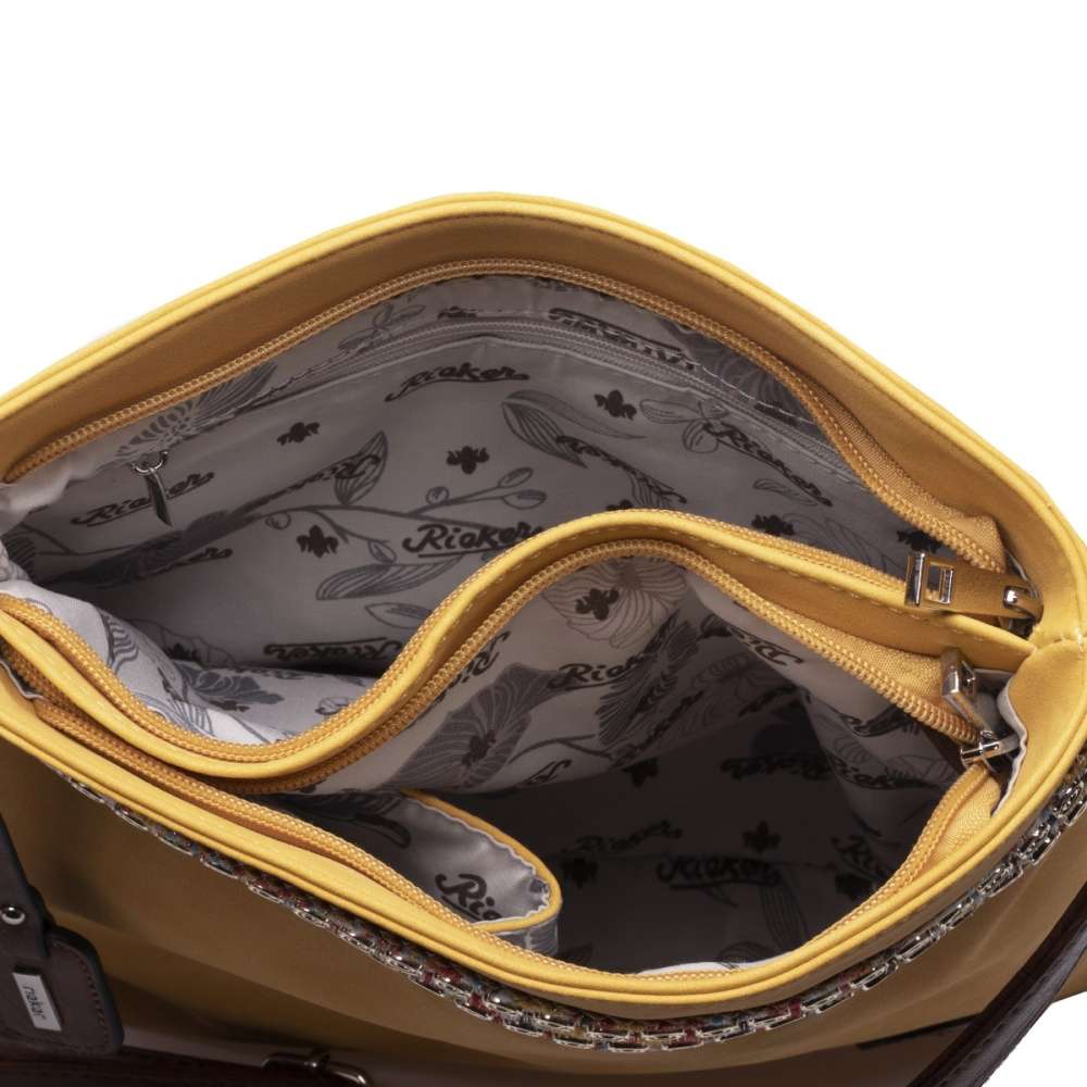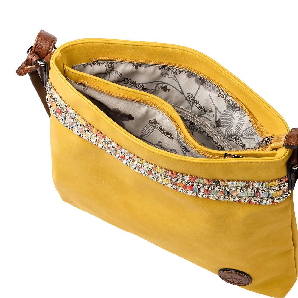 Tato dámská kabelka od značky Rieker má velice poutavý svršek a přesvědčí určitě každou ženu, která se nebojí vyjít z davu. Krásná žlutá barva, ozdobné logo a pestrý barevný pruh tvoří dohromady nádherný harmonický celek.