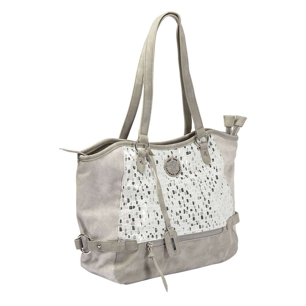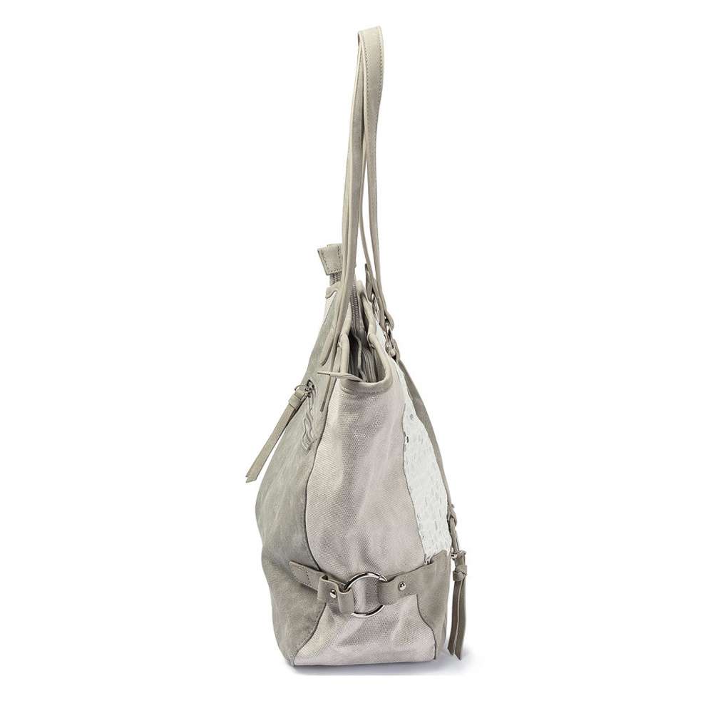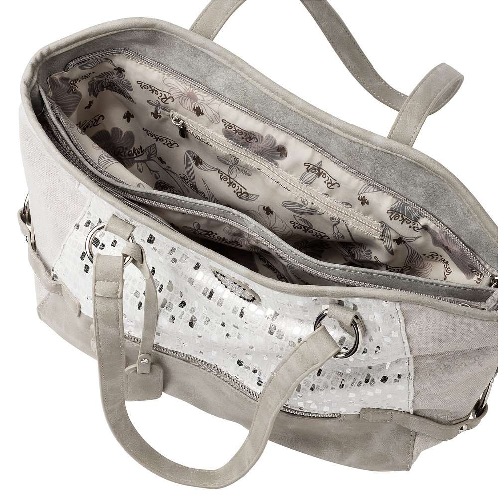 Zajímavá kabelka od značky Rieker má kombinovaný svrchní materiál, kde dominují lesklé detaily a přívěsek s malým logem.