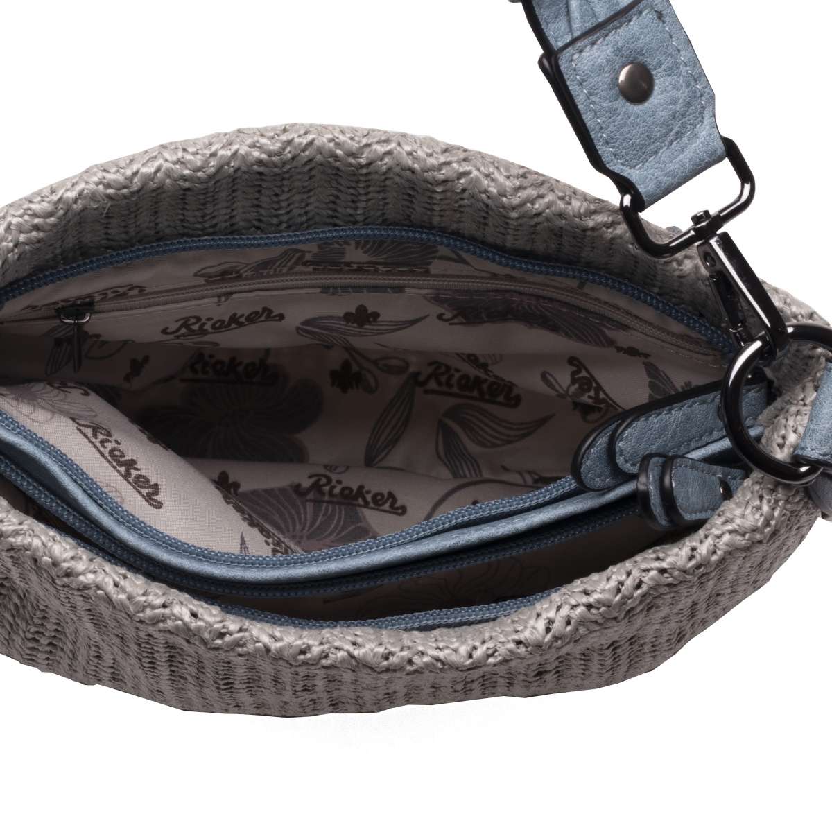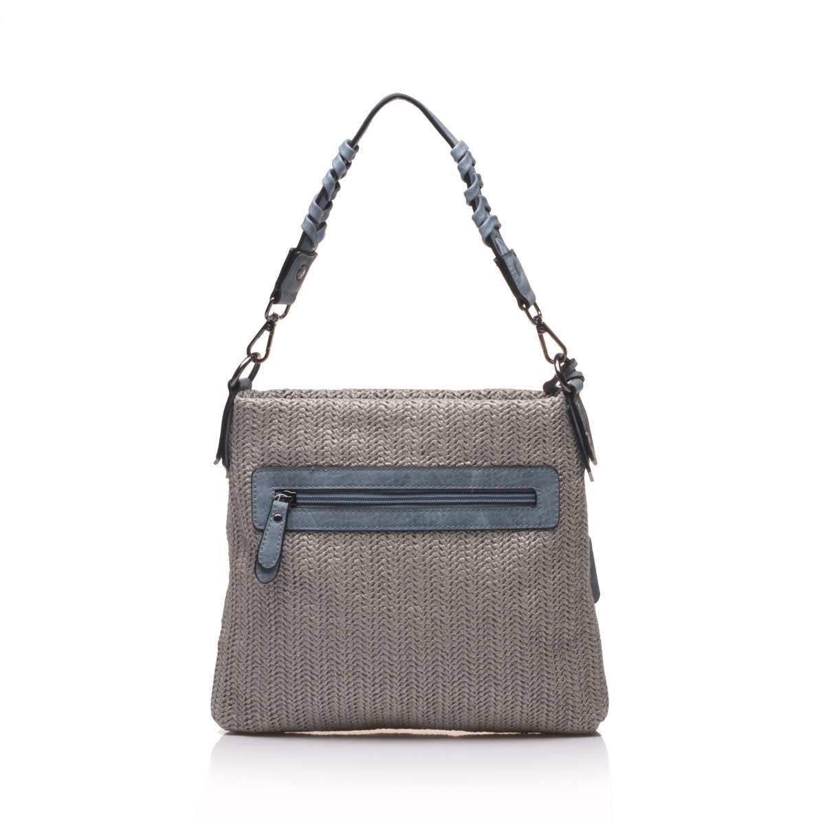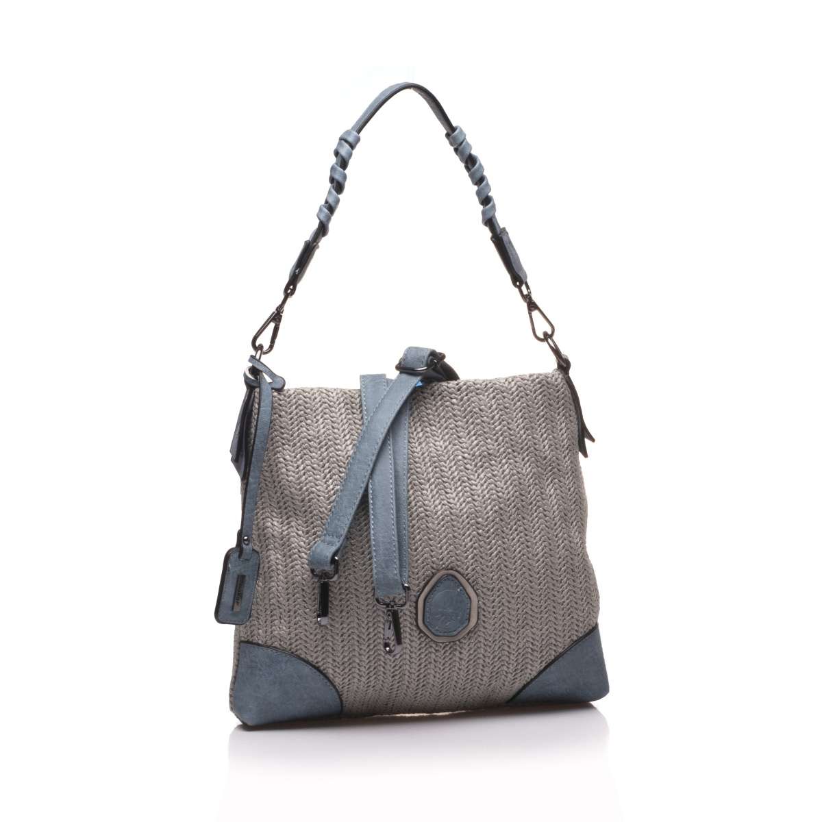 Svršek kabelky je vyroben ze syntetického materiálu v šedé barvě. Přední strana kabelky je zdobena pleteným vzorem a modrými doplňky. Taška má dlouhý popruh, který si můžete nastavit na Vámi zvolenou délku či jej odepnout.