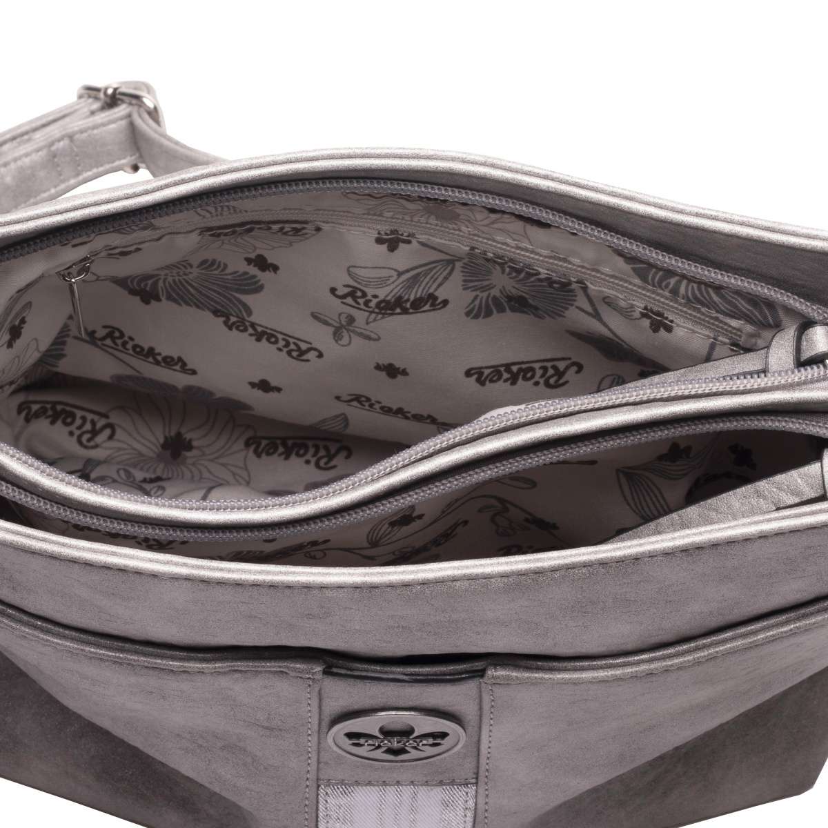 Tato dámská kabelka od značky Rieker v šedé barvě má zdobný barevný pruh, přívěsek a kovové logo. Na přední straně se nachází kapsa s magnetickým klipem, která slouží k uložení různých drobností.