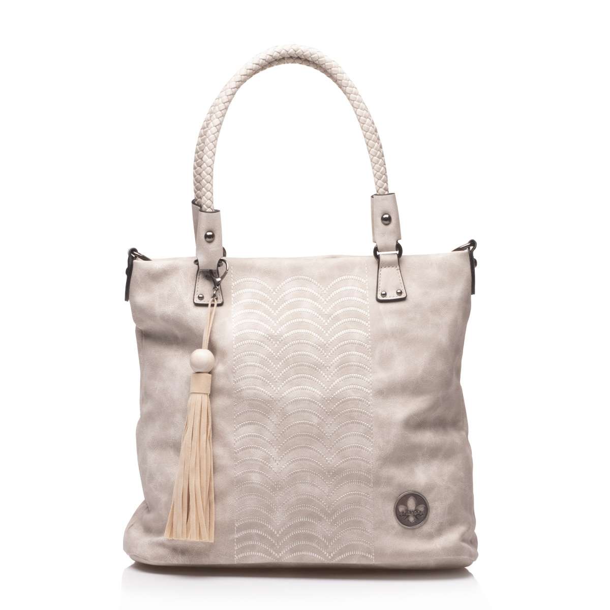 Béžová kabelka Rieker s všitým decentním vzorkem na přední straně a odepínatelným třásňovým přívěskem.