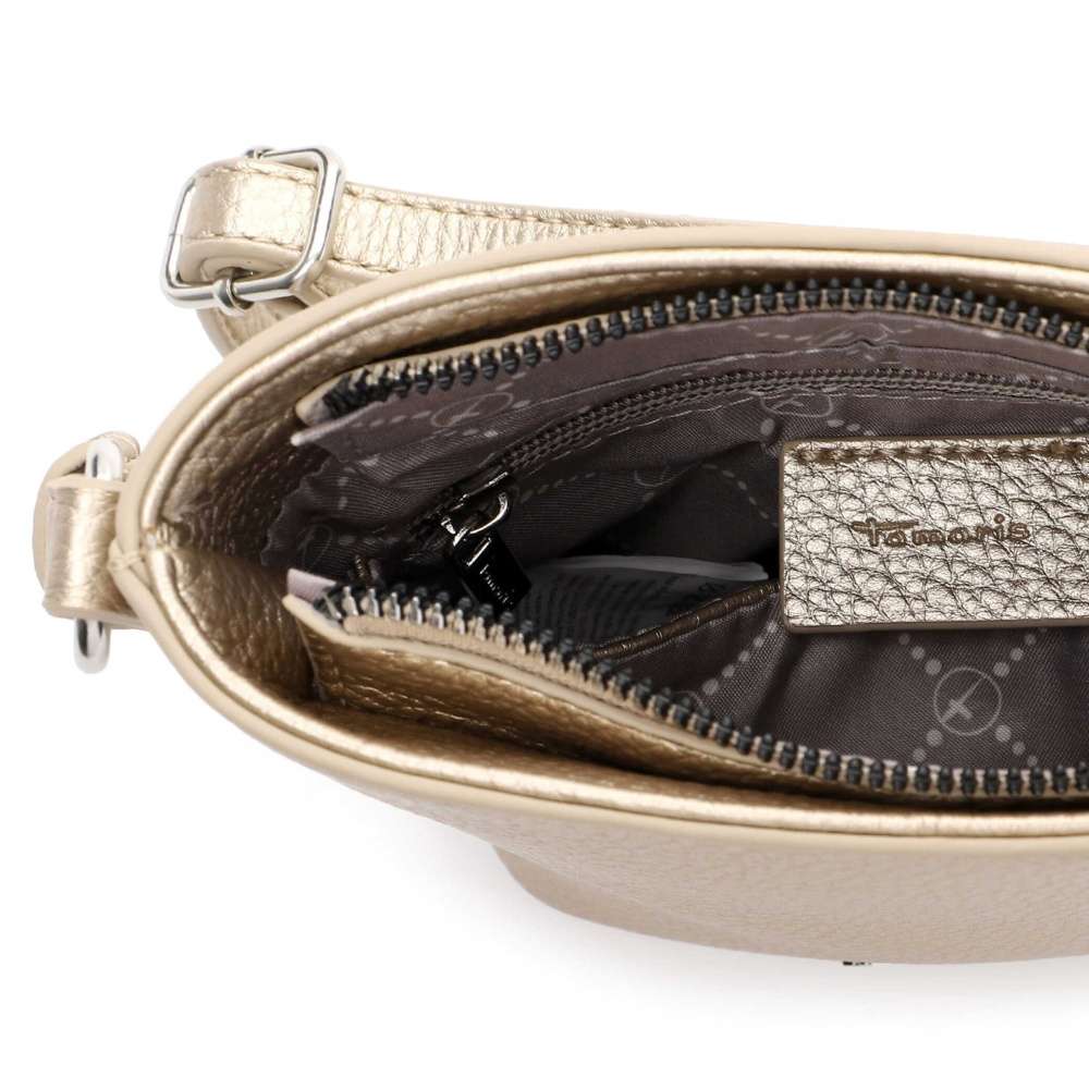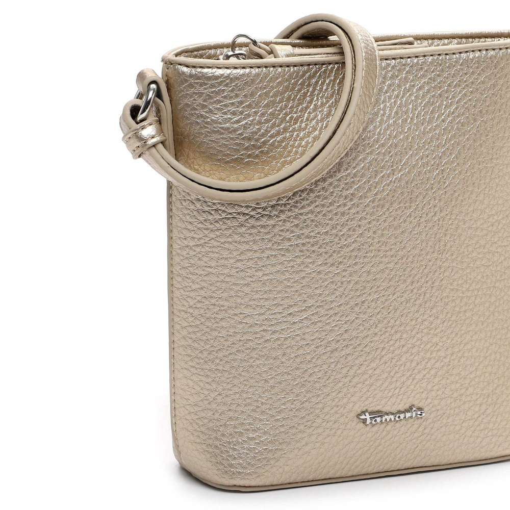 Kabelka značky Tamaris je ztělesněním moderní elegance. Jemné zlaté odlesky dodávají modelu luxusní efekt a decentní stříbrné logo na přední straně působí jako podpis kvality a podtrhuje její sofistikovaný charakter. Promyšleně řešený interiér se zapínáním na zip ukrývá praktické kapsičky na vše, co chcete mít dokonale zorganizované, zatímco zadní kapsa na zip nabízí rychlý a diskrétní přístup k nezbytnostem. Variabilní popruh lze nastavit k dokonalému pohodlí při nošení. Tato kabelka je ideální doplněk pro ženy, které milují nadčasový styl s nádechem luxusu.