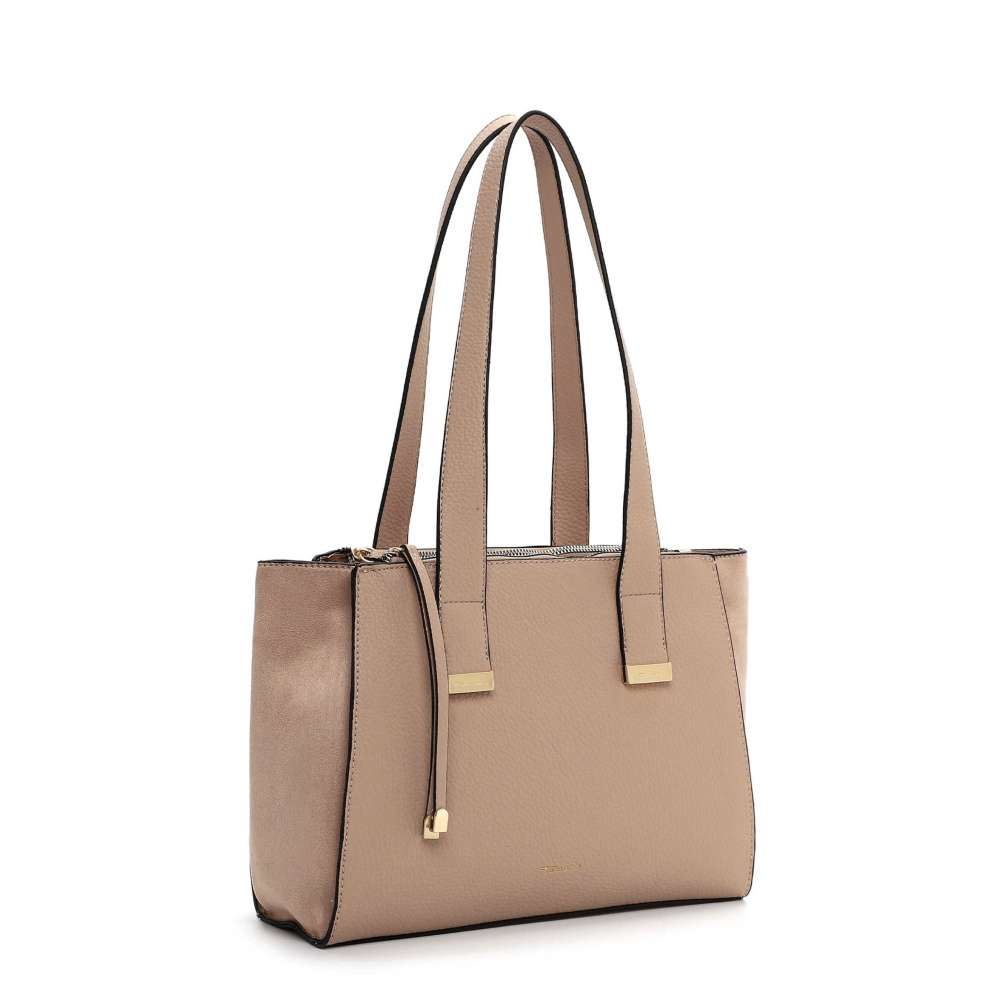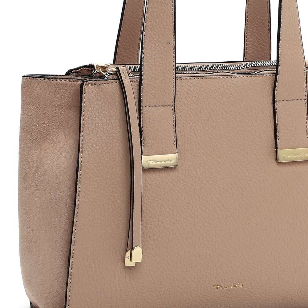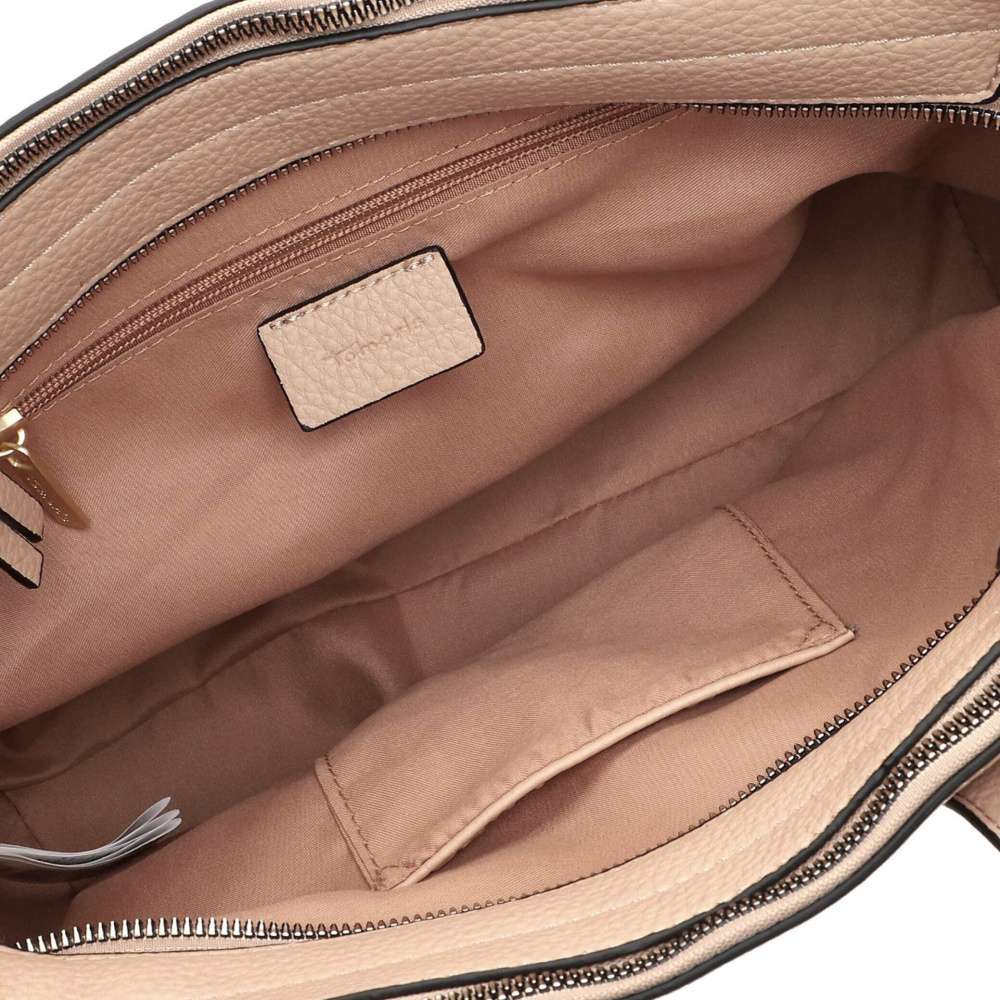 Kabelka Tamaris je perfektním společníkem pro ženy, které hledají praktický doplněk spojený s nadčasovou elegancí, jenž dokáže podtrhnout osobitý styl a doplnit každodenní i formální outfity. Její čisté linie v univerzální béžové barvě působí sofistikovaně, přičemž jemné aplikace zlaté barvy s logem značky na přední straně dodávají kabelce decentní nádech luxusu. Hlavní prostor kabelky je uzavíratelný zipem s atraktivní visačkou a zajistí bezpečné uložení vašich věcí. Vnitřní členění je pečlivě navrženo – naleznete zde dvě menší přihrádky vhodné pro klíče, mobil, drobnou kosmetiku nebo další nezbytnosti, díky čemuž budete mít vše přehledně uspořádané a vždy po ruce. Dva pevné popruhy umožňují kabelku pohodlně nosit přes rameno podle aktuálních potřeb. Univerzální design této kabelky zaručuje, že bude harmonicky ladit s jakýmkoliv outfitem a stane se spolehlivým a elegantním doplňkem, který doplní váš šatník a přinese do každého dne kousek luxusu, harmonie a praktické organizace. Rozměry: cca V 22 cm x Š 31 cm x H 13 cm Vnitřní uspořádání: kabelka je dělená
