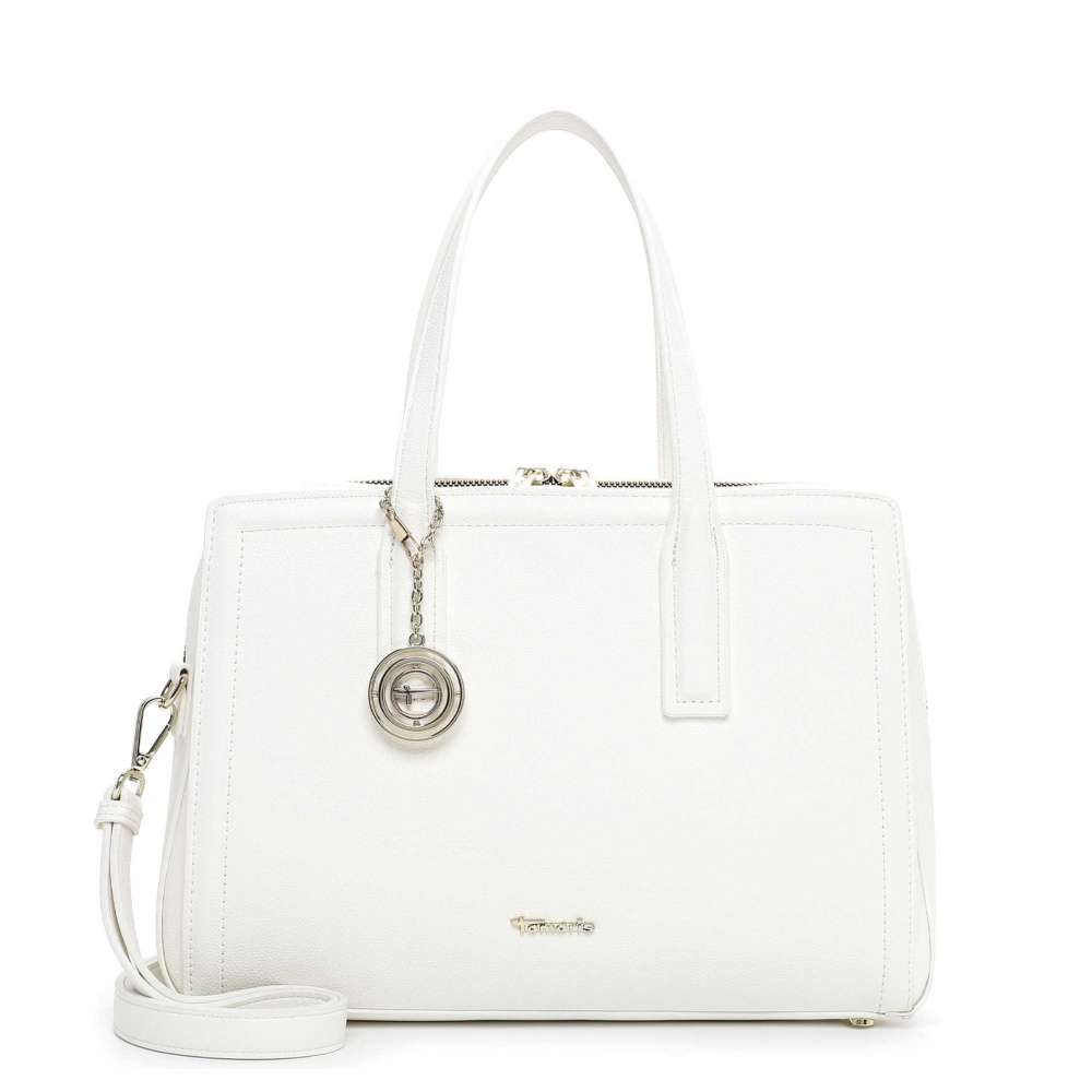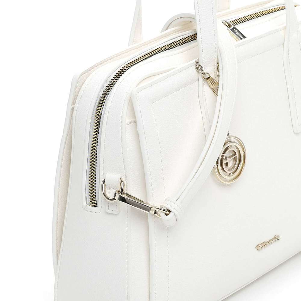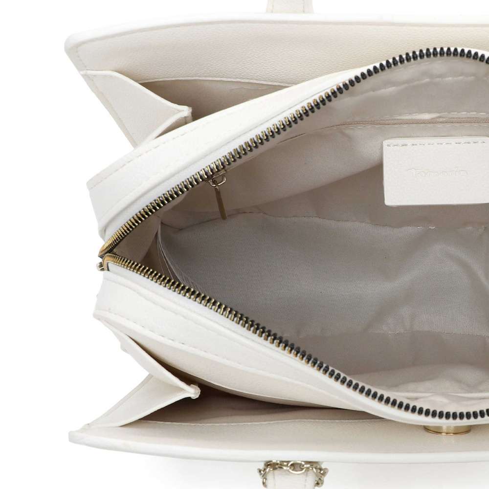 Tato kabelka Tamaris v elegantní bílé barvě je opravdovým klenotem pro každou ženu, která chce spojit nadčasový styl s praktičností. Logo značky stříbrné barvy a odnímatelná visačka jí dodávají jedinečnost vzhledu. Kabelka je promyšleně rozdělena do tří samostatných oddílů – dva boční se snadno uzavírají magnetickým klipem a středová část zipem. Hlavní prostor má dvě menší kapsičky, které zajistí přehledné uspořádaní drobností. Dva pevné popruhy zajišťují pohodlné nošení v ruce nebo připnutím nastavitelného popruhu můžete zvolit nošení přes rameno. Tento model TAMARIS je dokonalým spojením funkčnosti a ženského šarmu – kabelka, která doplní každý outfit a stane se vaším spolehlivým společníkem při každodenních příležitostech.