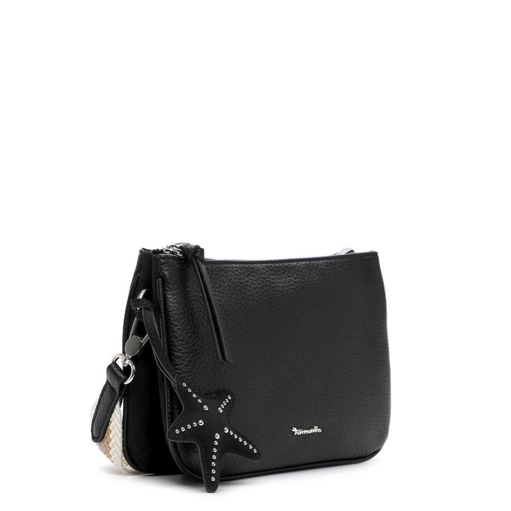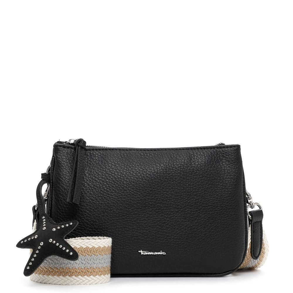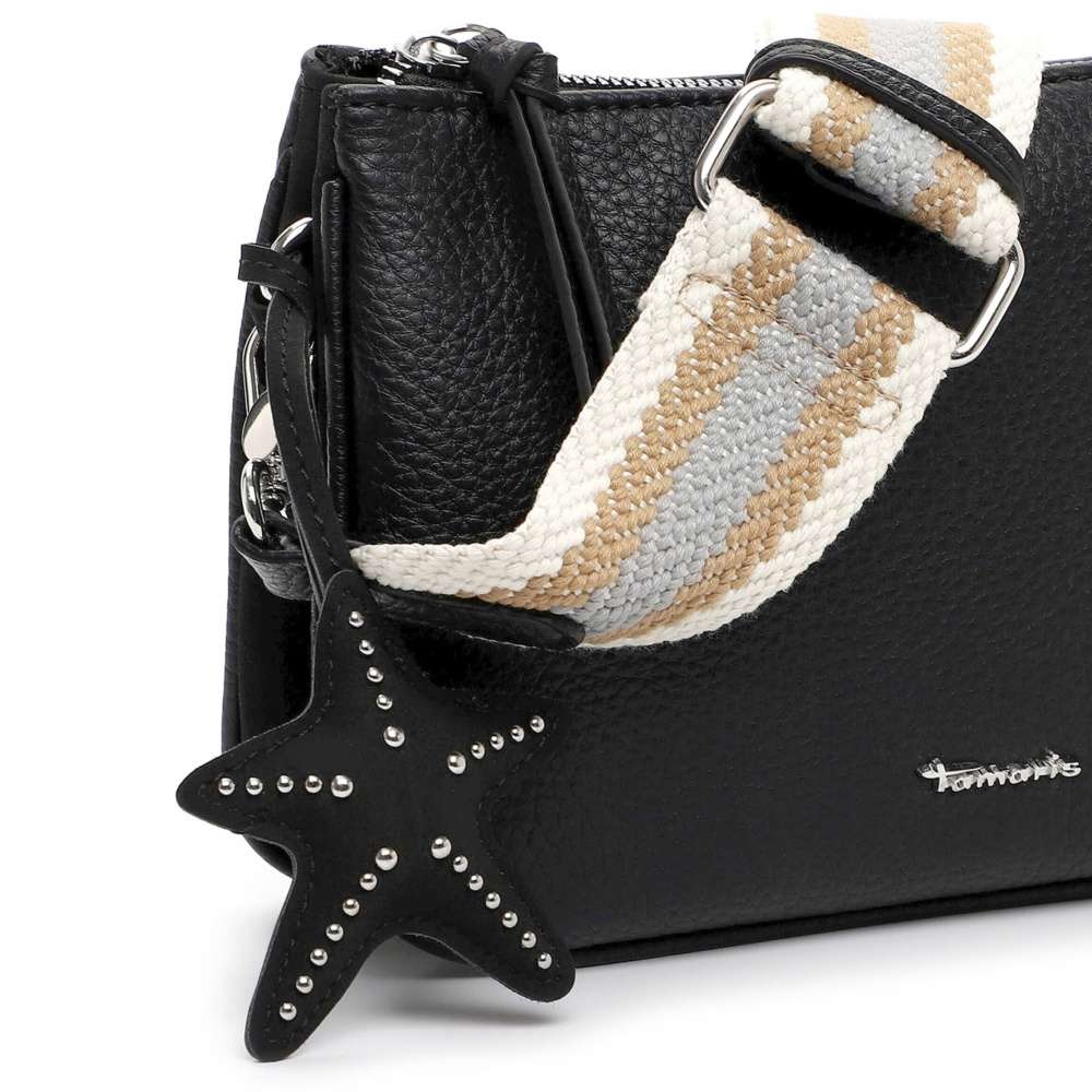 Kabelka značky Tamaris představuje nadčasový styl v moderním provedení, který s lehkostí zapadne do vašeho šatníku. Černý svršek je doplněn stříbrným logem značky a výraznou hvězdicovou aplikací, která dodává kabelce osobitý charakter. Hlavní prostor uzavíraný zipem je rozdělen do dvou samostatných částí, z nichž každá obsahuje menší kapsičku pro bezpečné a přehledné uspořádání vašich osobních věcí. Zadní část kabelky je doplněna další menší kapsičkou, která poskytuje rychlý a diskrétní přístup k drobnostem. Odepínatelný a délkově nastavitelný popruh umožňuje variabilní nošení přes rameno nebo přes tělo, takže kabelku snadno přizpůsobíte aktuálním potřebám. Popruh navíc svým propracovaným vzhledem a barevným kontrastem vytváří působivý vizuální dojem. Tato kabelka je víc než doplněk – je to stylový společník, který spojuje praktičnost a módní výraz v jednom nadčasovém kousku.