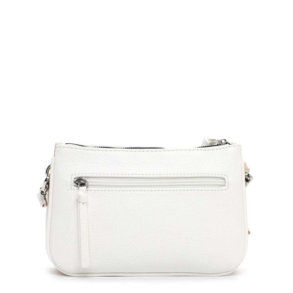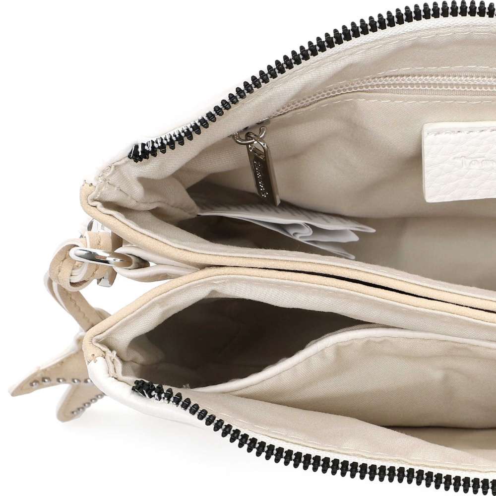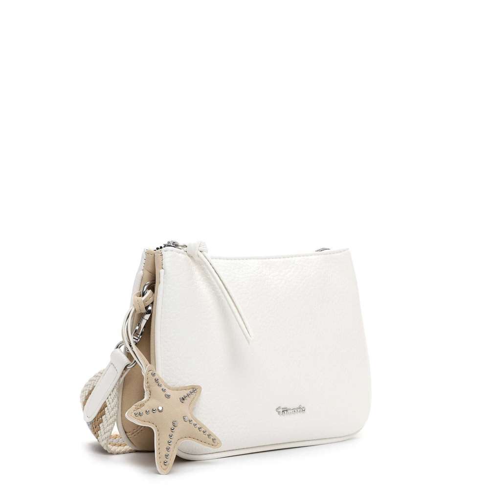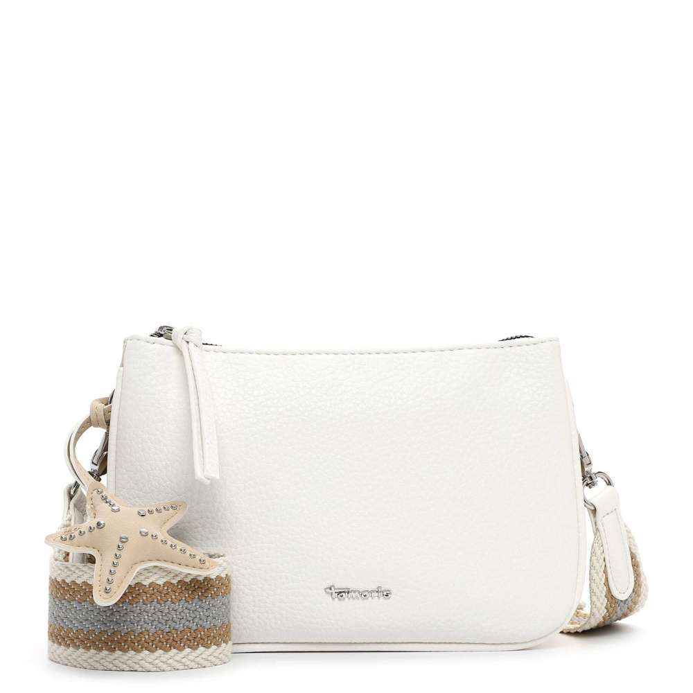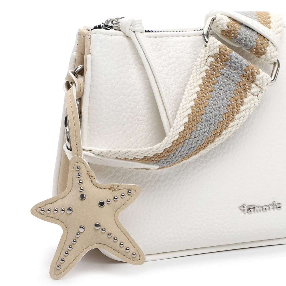 Kabelka značky Tamaris představuje nadčasový styl v moderním provedení, který s lehkostí zapadne do vašeho šatníku. Bílý svršek je doplněn stříbrným logem značky a výraznou hvězdicovou aplikací, která dodává kabelce osobitý charakter. Hlavní prostor uzavíraný zipem je rozdělen do dvou samostatných částí, z nichž každá obsahuje menší kapsičku pro bezpečné a přehledné uspořádání vašich osobních věcí. Zadní část kabelky je doplněna další menší kapsičkou, která poskytuje rychlý a diskrétní přístup k drobnostem. Odepínatelný a délkově nastavitelný popruh umožňuje variabilní nošení přes rameno nebo přes tělo, takže kabelku snadno přizpůsobíte aktuálním potřebám. Popruh navíc svým propracovaným vzhledem a barevným kontrastem vytváří působivý vizuální dojem. Tato kabelka je víc než doplněk – je to stylový společník, který spojuje praktičnost a módní výraz v jednom nadčasovém kousku.