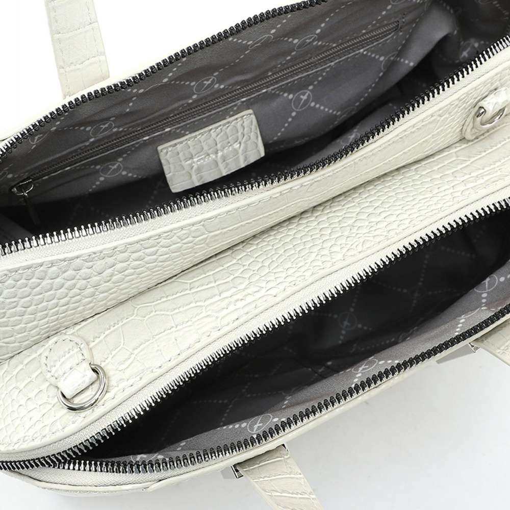 V horní části má dva zipy pro otevření dvou samostatných kapes a v jedné z nich je kapsička na zip pro uložení drobností.