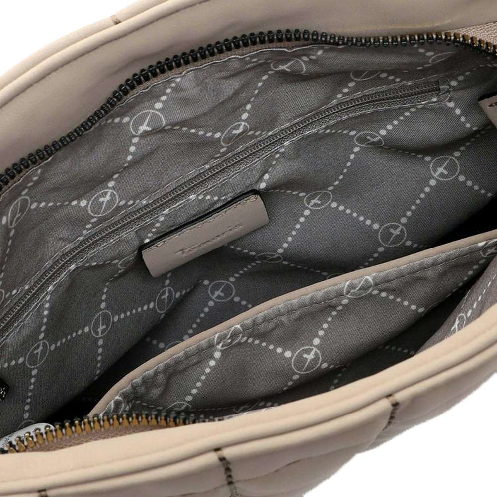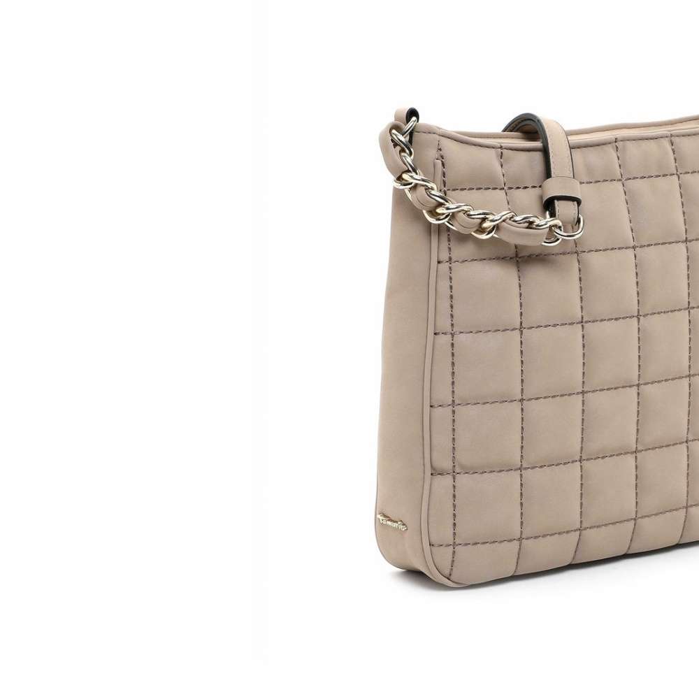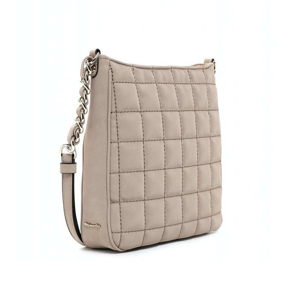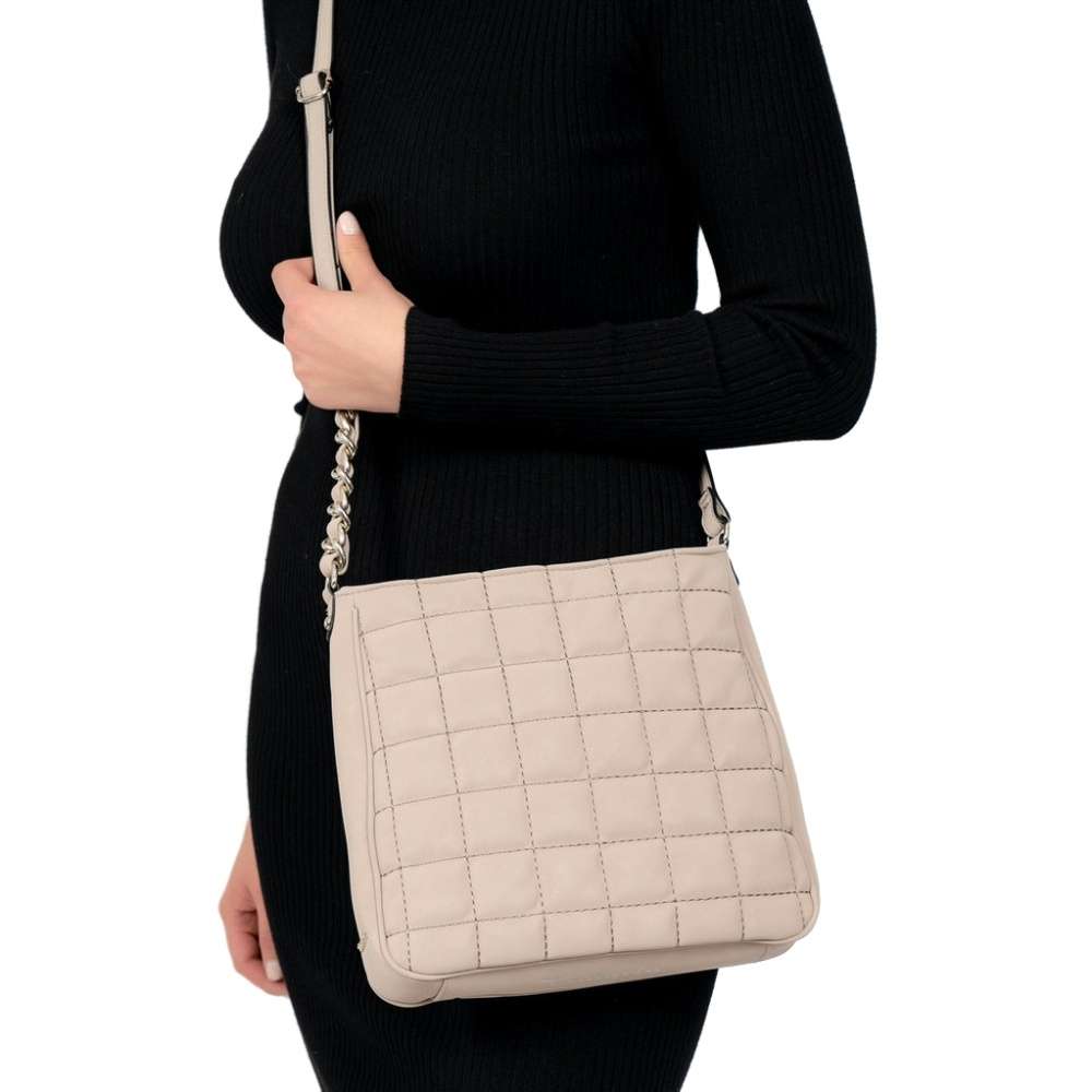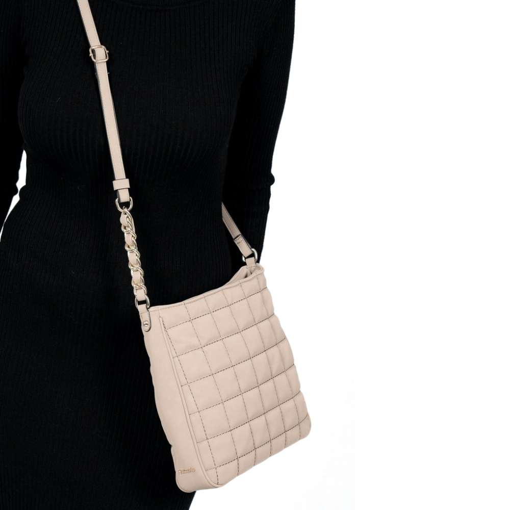 Taška přes rameno s nastavitelným popruhem, jemný semišový materiál, prošití v barvě kabelky do čtverců, to vše jsou znaky této kabelky. Uzavírá se pomocí zipu, po jehož otevření uvnitř naleznete kapsičky pro Vaše drobnosti.