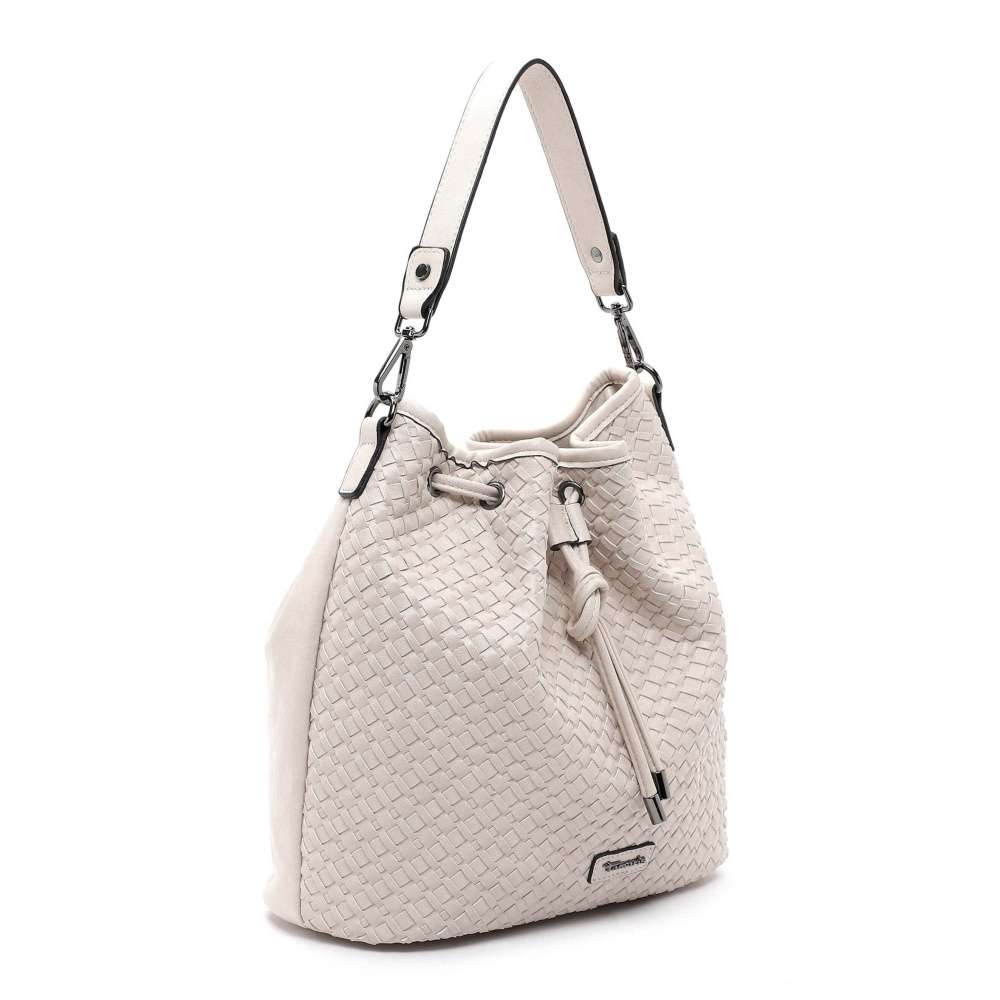 Touto jedinečnou kabelkou od značky Tamaris zaujmete celé své okolí. Svršek zdobí proplétané vzory a logo značky na přední straně. Uzavírání na šňůrku v kombinaci s magnetickým prvkem utváří vzhled kabelky. Hlavní kapsa je nedělená a disponuje menšími kapsičkami pro Vaše cennosti. Na zadní straně se nachází menší všitá kapsička na zip. Kabelka má délkově nastavitelný, odepínatelný popruh, díky kterému lze kabelku nosit i přes rameno. Ať už Vaše cesty povedou kamkoli, budete nepřehlédnutelná. Rozměry: v 28 cm x š 30 cm x h 15 cm Vnitřní uspořádání: kabelka není dělená Kabelka má délkově nastavitelný popruh, který lze odepnout.