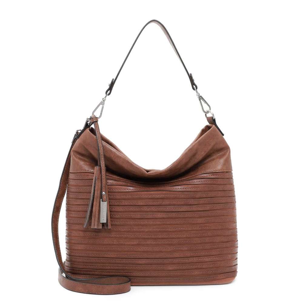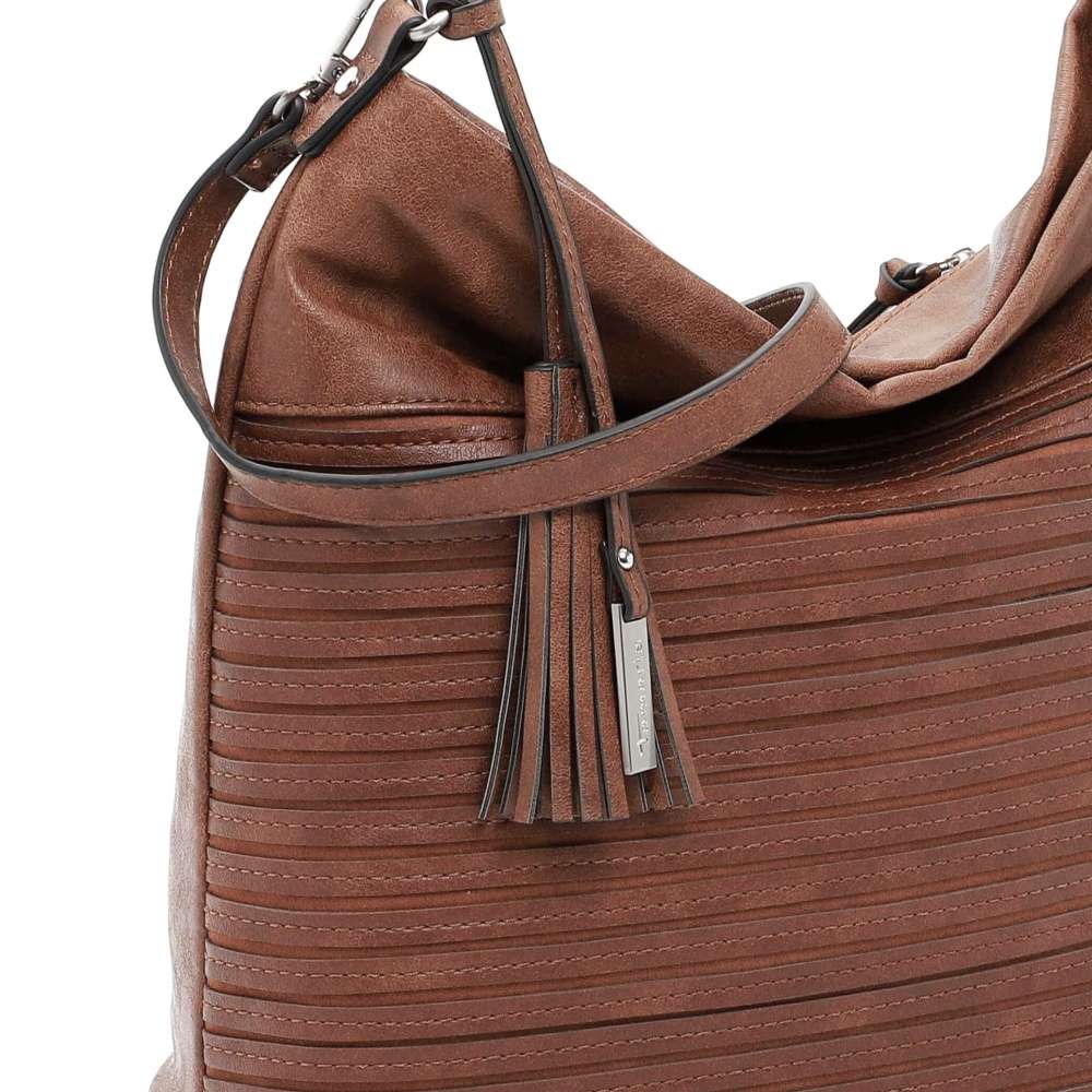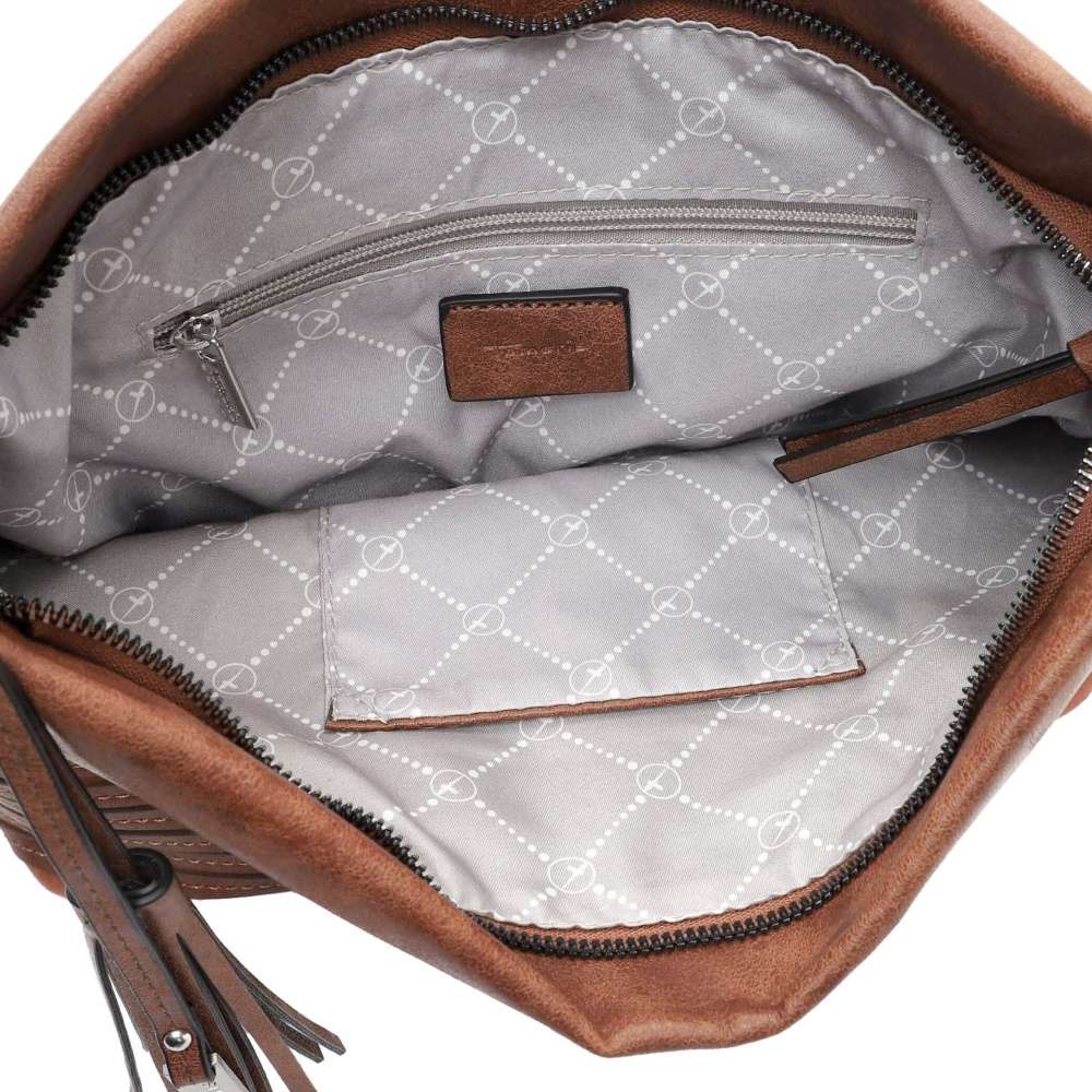Kabelka značky TAMARIS s originálním svrškem, který zdobí přívěsek s logem značky a třáseň. Po otevření vrchního zipu se otevře prostorná kapsa, kde jsou malé kapsičky pro přehledné uložení drobností. Určitě oceníte i malou kapsičku na zadní straně uzavřenou zipem. Tašku můžete nosit přes rameno díky praktickému kratšímu popruhu a délkově nastavitelnému, oba jsou odnímatelné. Pořiďte si tento doplněk pro dokonalý vzhled a doplňte ho botami z naší nabídky. Rozměry: cca v 32 cm x š 42 cm Vnitřní uspořádání: kabelka není dělená Kabelka má délkově nastavitelný popruh, který lze odepnout.