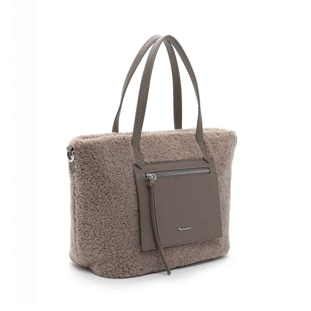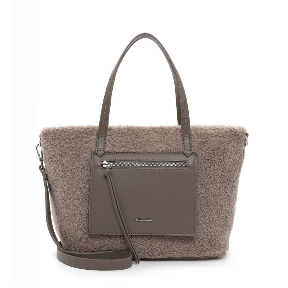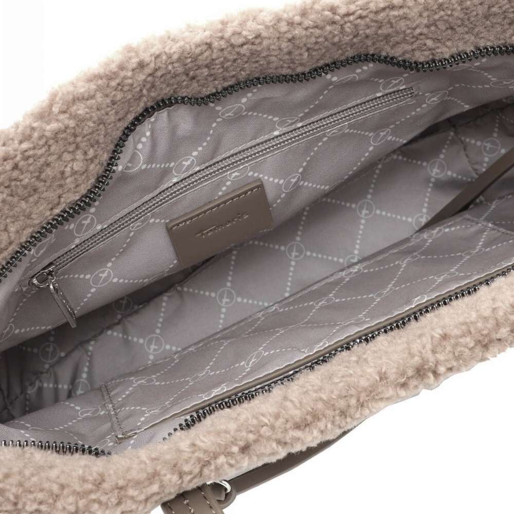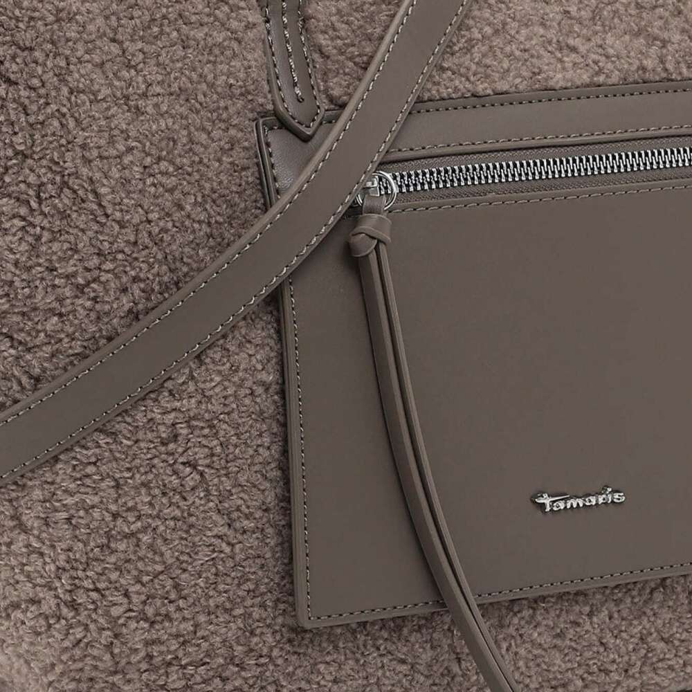 Tato kabelka od značky Tamaris je originál, který obohatí Váš šatník netradičním kouskem. Příjemný chlupatý materiál je zdobený kapsičkou se zipem a zdobným logem značky. Vrchní zip uzavírá prostor s dvěma malými kapsičkami, kde uložíte své drobnosti. Nosit ji lze v ruce díky kratším úchytům nebo přes rameno díky nastavitelnému popruhu, který je odepínatelný. Pokud jste ráda středobodem pozornosti neváhejte s koupí této kabelky. Rozměry: cca v 24 cm x š 28,5 cm Vnitřní uspořádání: kabelka není dělená Kabelka má délkově nastavitelný popruh, který lze odepnout.