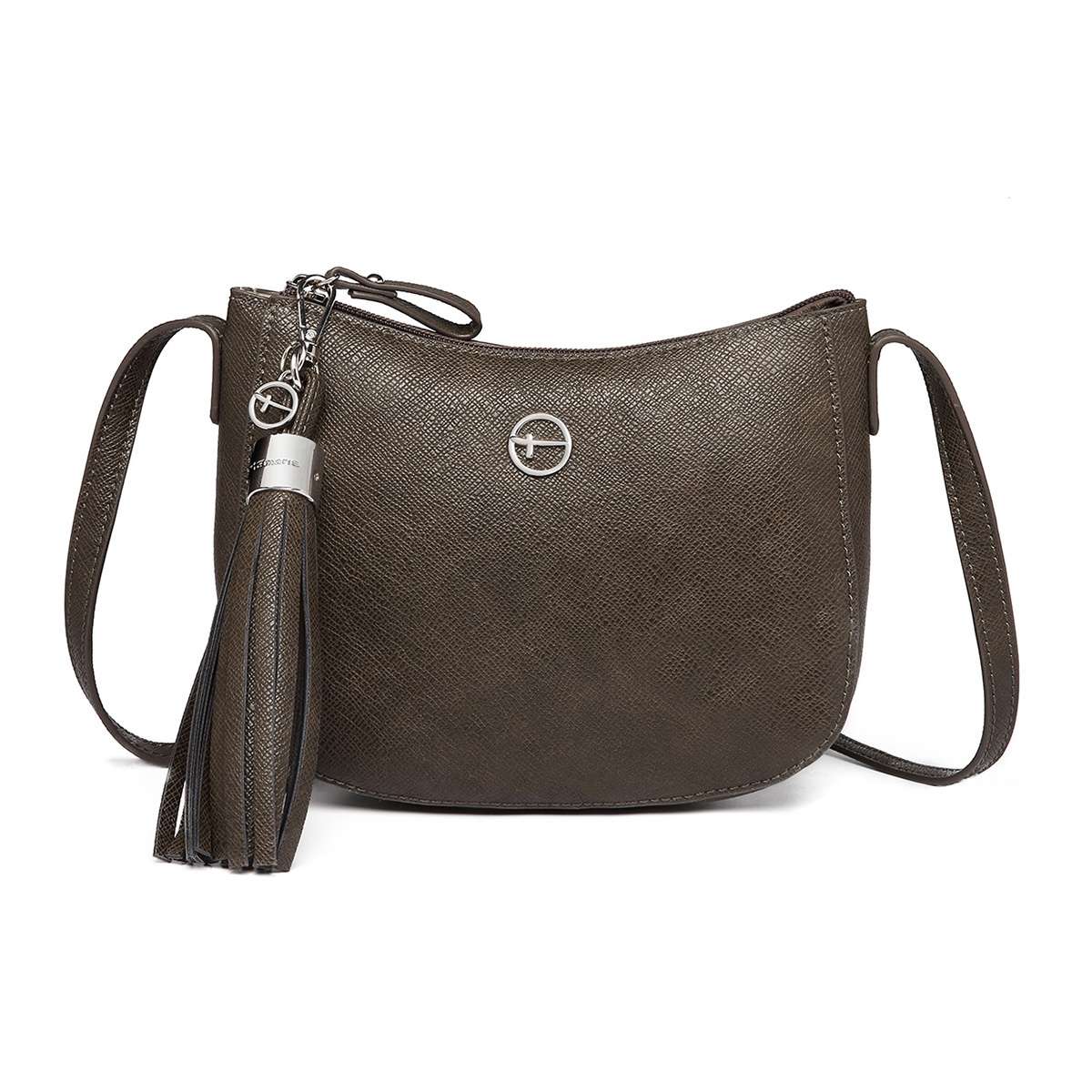 Malá dámská kabelka značky Tamaris v zelené barvě je zdobena dominujícím logem na přední straně a třásňovým přívěskem, který lze jednoduše odepnout.