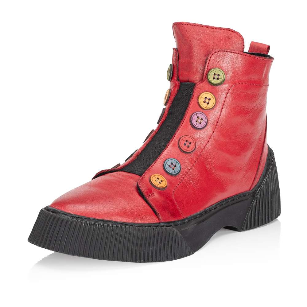 S těmito dámskými kotníkovými botami značky IBERIUS rozzáříte chmurné podzimní dny. Jednoduchý kožený svršek v červené barvě je na přední straně efektně ozdoben pestrobarevnými knoflíky. Ke snadnému nazutí slouží funkční zipy nacházející se na vnitřní straně modelu a gumky na předním díle. Kvalitní vroubkovaná podešev doplněná o měkkou vyjímatelnou stélku Vám zaručí komfort i při celodenním nošení. Tato obuv udělá i jednoduchý outfit výjimečným.