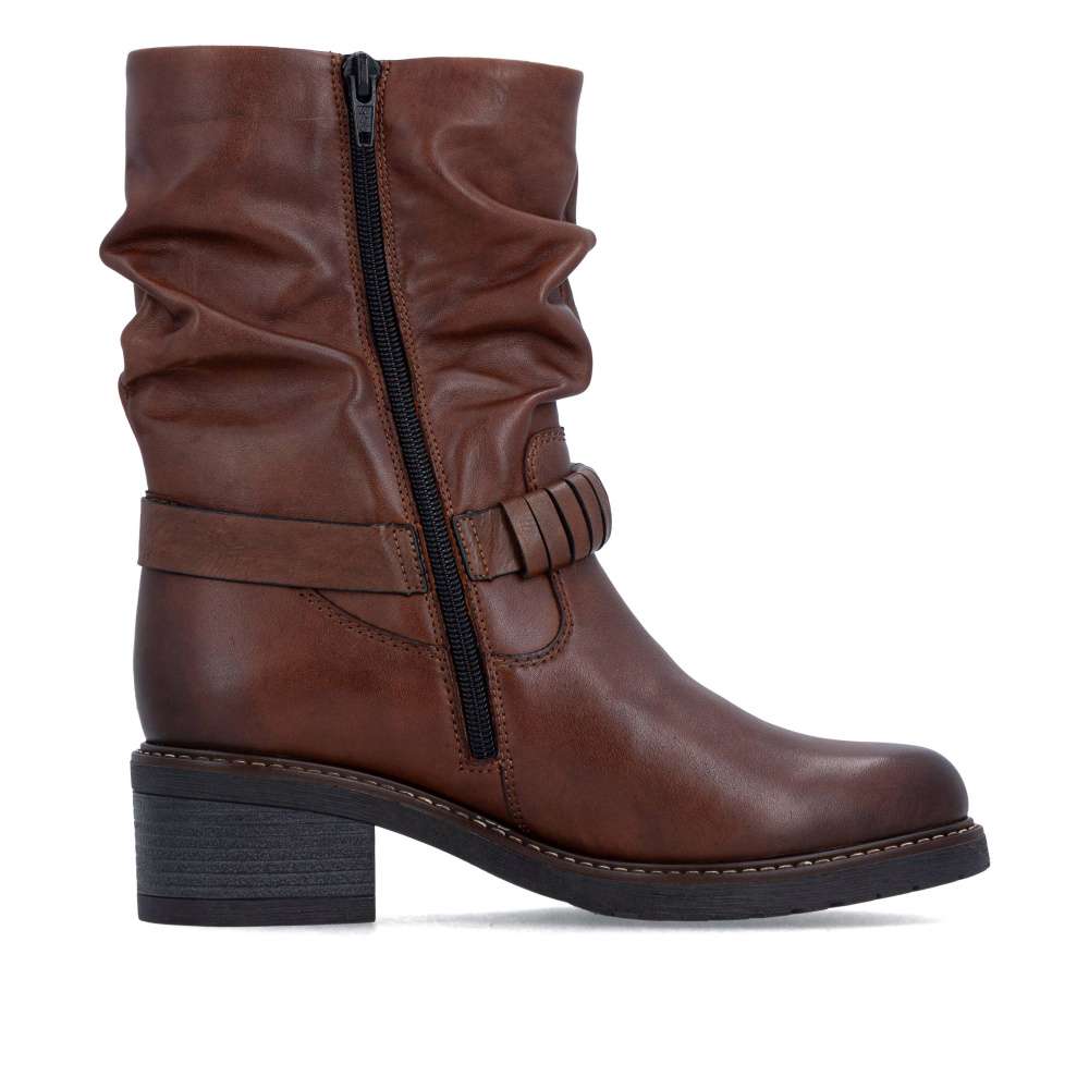 Detailní informace Obuv REMONTE – jedná se o vyšší řadu značky RIEKER, tato obuv se vyznačuje vynikající kombinací svrchních materiálů. Dámské kotníkové boty značky RIEKER jsou navrženy pro ženy, které hledají stylový a zároveň praktický doplněk do svého šatníku. Hnědý kožený svršek působí elegantně svým decentním řasením materiálu v horní části bot, přičemž dekorativní prvek se sponou u kotníku a decentní logo značky dodávají obuvi výjimečný vzhled. Rychlé obutí zajistí funkční zip umístěný na boční části a díky němu vklouznete do vyjímatelné stélky a hřejivé podšívky z pravé ovčí vlny, které se postarají o komfort i při celodenním nošení. Tyto boty budou ideální volba pro každodenní městský styl i volný čas.