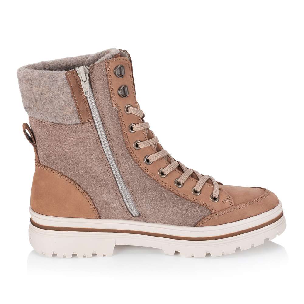 Obuv REMONTE – jedná se o vyšší řadu značky RIEKER, tato obuv se vyznačuje vynikající kombinací svrchních materiálů. Tyto stylové zimní boty z kvalitní kůže mají zajímavou kombinaci barev a jejich půvab zvýrazní textilní lem horního okraje. Módní design dotváří decentní logo značky vystihující originalitu tohoto modelu. S jejich nepromokavou vrstvou materiálu svršku budou ideální volbou pro chladné a sychravé dny, kdy Vaše nohy budou chráněny před vlhkostí. Praktický boční zip usnadní obouvání a šněrováním si je upravíte k dokonalému pohodlí, zatímco vnitřek s hřejivou podšívkou z ovčí vlny a termo stélkou poskytnou maximální tepelný komfort. Každý krok bude doprovázen speciálně navrženou podešví snižující riziko uklouznutí. Tento model je skvělý společník na zimu, který spolehlivě zahřeje a zároveň podtrhne váš styl každý den. Technologie: Thermo stélka – ze spodní strany je hliníková fólie, která poskytuje výborné termoizolační vlastnosti a chrání tak chodidlo před chladem. Remonte TEX – funkční vrstva, díky které je svršek boty nepromokavý a přesto prodyšný. GLASS FIBRE SOLE – inovativní podrážka ze skleněných vláken nabízí extra přilnavost i na zledovatělém povrchu. Tato bota je vybavena vyjímatelnou stélkou. Podšívka je vyrobena z pravé ovčí vlny.