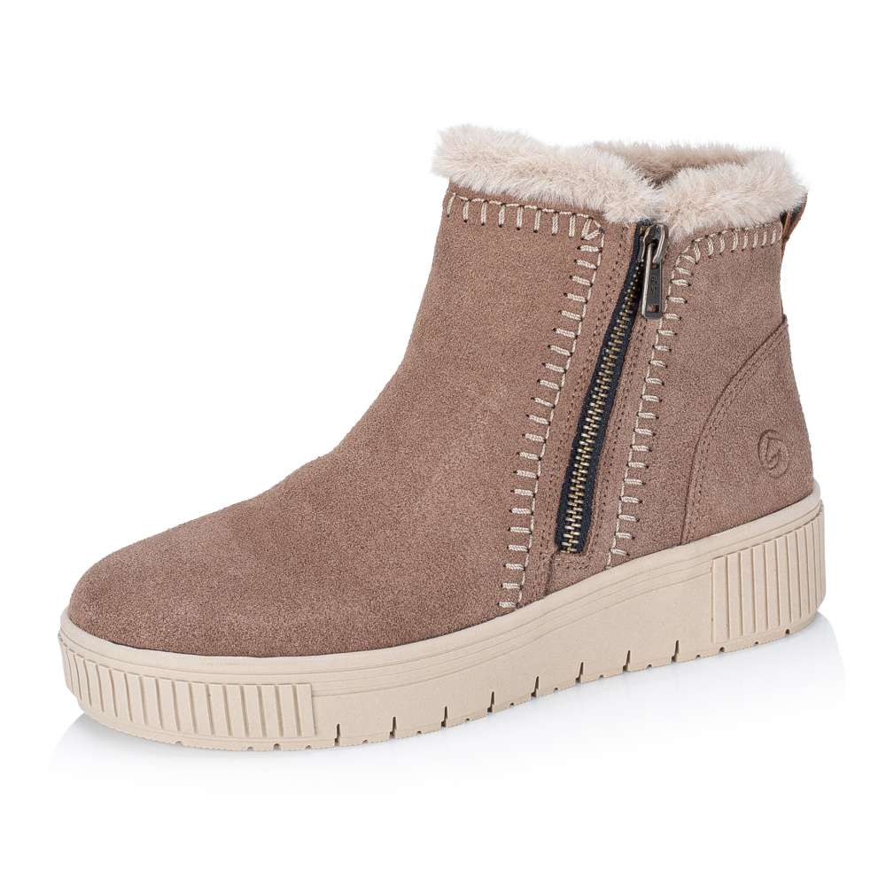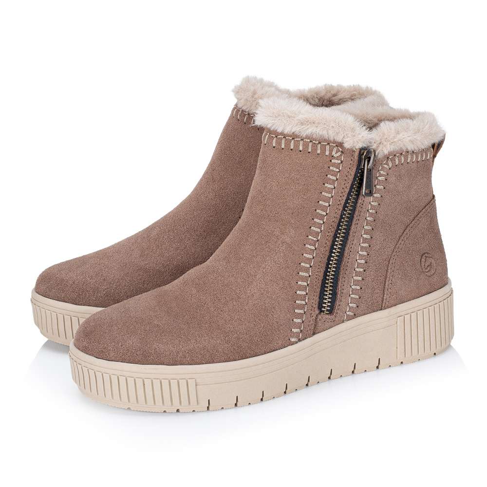 Detailní informace Obuv REMONTE – jedná se o vyšší řadu značky RIEKER, tato obuv se vyznačuje vynikající kombinací svrchních materiálů. Tento zimní model značky RIEKER v hnědém odstínu je ideálním spojením praktičnosti a stylového designu. Kožený svršek dekorovaný výrazným šitím světlou nití dodává botám unikátní vzhled, který zvýrazní lemování horního okraje kožíškem. Vnitřní hřejivá podšívka z ovčí vlny udrží vaše nohy v teple i během chladných zimních dnů a vklouznete do ní díky bočním zipům poskytujícím jednoduché nazutí. Praktickým doplňkem je vyjímatelná stélka, která nejen umožní snadnou údržbu nebo možnost výměny, ale svojí měkkostí vytvoří dokonalý komfort každým krokem a k dokonalému pohodlí přispěje vyšší stabilní podešev. Tento model je skvělou volbou pro ženy, které upřednostňují funkční obuv s vkusným designem - ať už do města, do práce nebo na zimní procházky.
