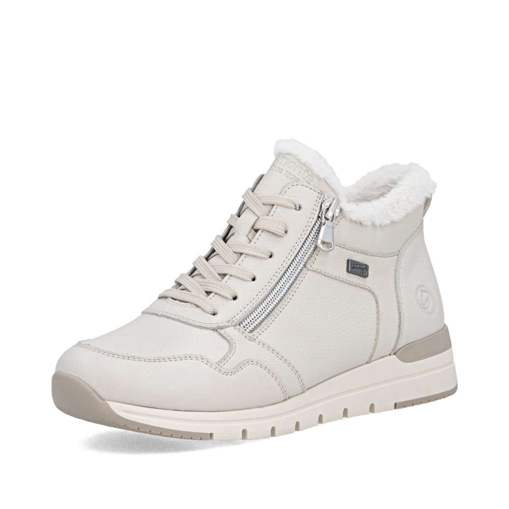 Obuv REMONTE je vyšší řada značky RIEKER, obuv se vyznačuje kvalitou použitých materiálů. Tento model je navržen pro ženy, které se nechtějí vzdát pohodlí během sychravých a studených dnů, nabízí ideální řešení pro každodenní nošení. Světlý svršek je doplněn kožešinovým lemem horního okraje a nepromokavou membránou, která spolehlivě ochrání před deštěm a sněhem, přičemž noha zůstává v suchu a komfortu. Obouvání je rychlé a bez námahy díky zipu v části nártu, zatímco šněrování zajišťuje přizpůsobení na míru a pevné držení nohy. Vnitřní komfort zaručuje měkká, vyjímatelná stélka a zateplení z ovčí vlny, které příjemně zahřeje i během mrazivých dnů. Tento model je skvělou volbou pro každou ženu, která hledá stylové a funkční zimní boty – ideální pro běžné nošení, do města, na procházky nebo víkendové výlety. Technologie: Remonte TEX – funkční vrstva, díky které je svršek boty nepromokavý a přesto prodyšný. Remonte Soft – unikátní stélka vyrobená z prodyšného materiálu, která svým tvarem a materiálem zajistí pocit pohodlí při celodenním nošení. Tato bota je vybavena vyjímatelnou stélkou. Podšívka je vyrobena z pravé ovčí vlny.