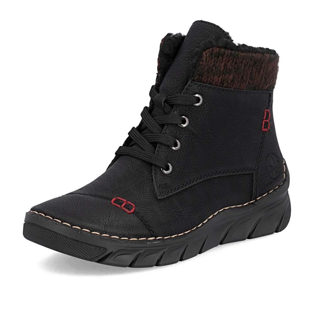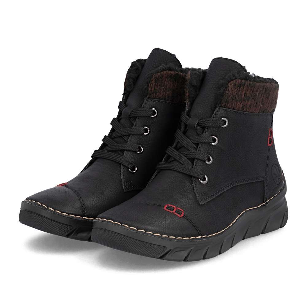 Dámské kotníkové boty RIEKER černé barvy představují ideální spojení nadčasového designu a maximálního pohodlí. Jemné prošívání, textilní lem horního okraje a decentní logo značky podtrhují stylový vzhled tohoto modelu. Praktické šněrování doplněné o boční zip zajistí snadné obutí i dokonalé přizpůsobení chodidlu. V chladnějším počasí oceníte vnitřní zateplení, zatímco lehká a flexibilní podešev s technologií Antistress efektivně tlumí nárazy a zvyšuje komfort při každém kroku. Ideální boty pro každodenní nošení, ať už do práce nebo pro volný čas. Technologie: Antistress – díky čtyřem antistresovým vlastnostem – lehkosti, pružnosti, prostornosti a vynikající absorpci nárazů – vám boty RIEKER nabídnou komfortnější chůzi.