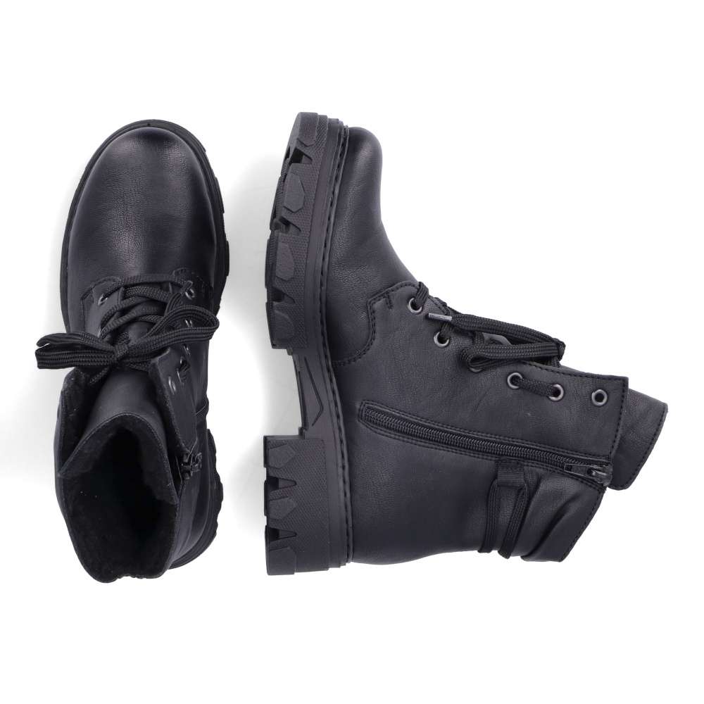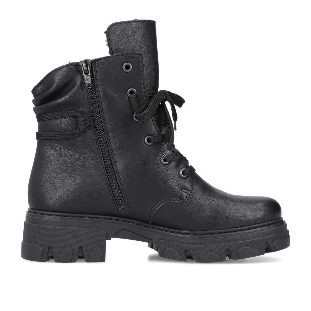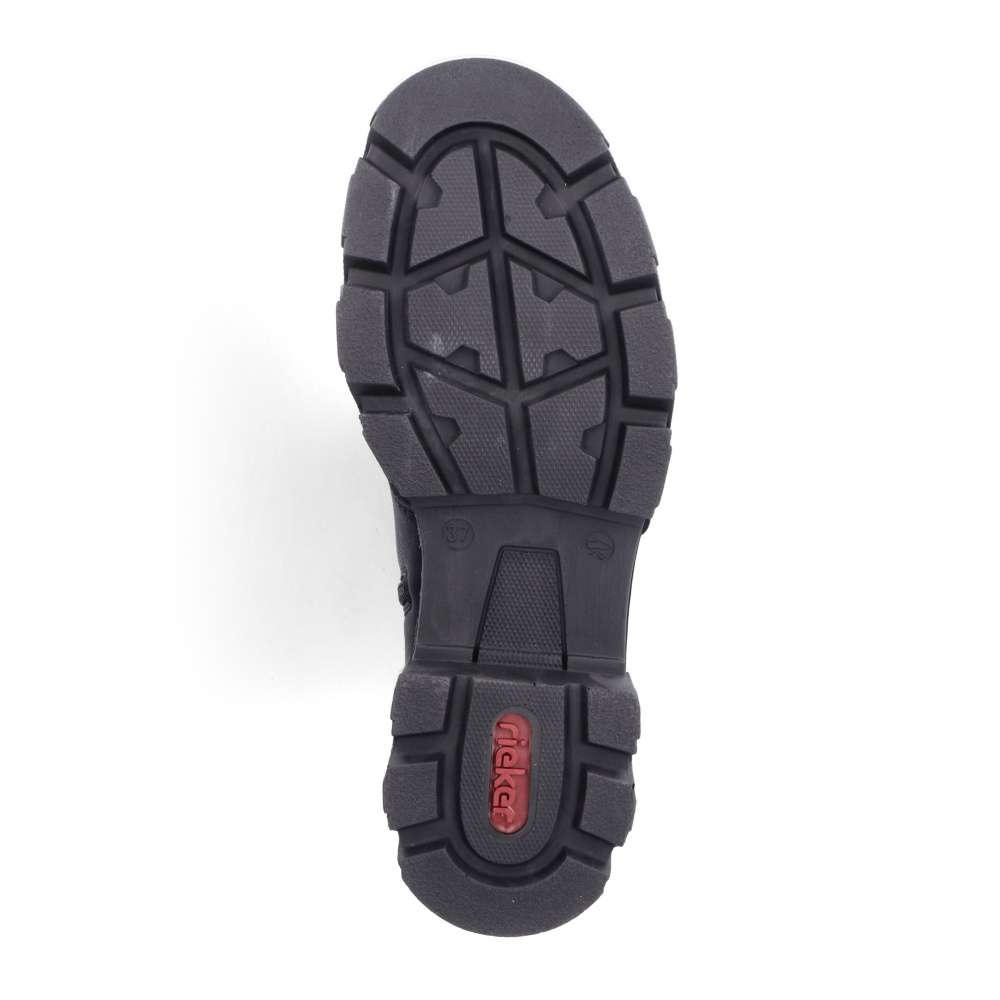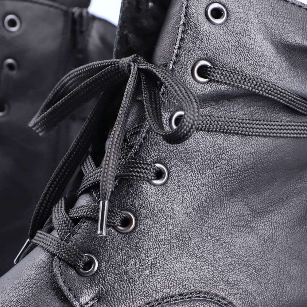 Značka RIEKER nabízí tento zimní kousek snadno kombinovatelný díky jednoduchému designu. Černý svršek nikdy nezklame a má ozdobné šněrování kolem kotníku pro moderní vzhled. Hřejivá podšívka udrží nohy v teple i v chladnějším počasí a měkká stélka Vás bude provázet pohodlím i při celodenních pochůzkách. Na vnitřní straně se nachází zip pro rychlé obutí a šňůrkami si můžete obuv přizpůsobit na Vaši nohu. Podešev s hrubším vzorem částečně zamezí uklouznutí, a tak cesta do práce nebo na nákupy bude bezpečná. Technologie: Antistress – podrážka je díky této technologii lehká, flexibilní, absorbuje nárazy při došlapu a snadno se přizpůsobí každé noze.