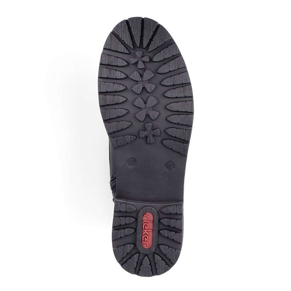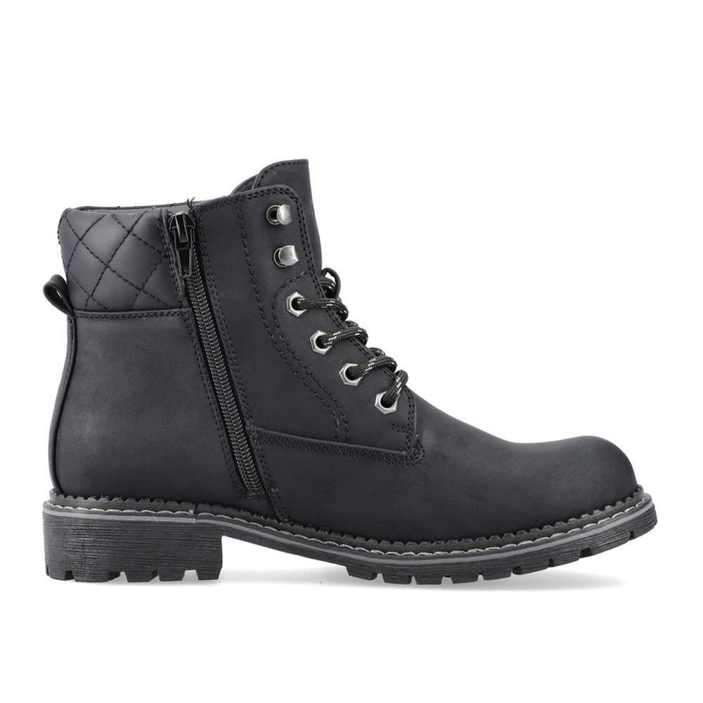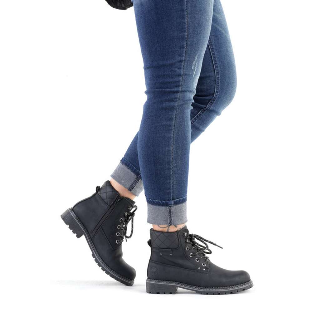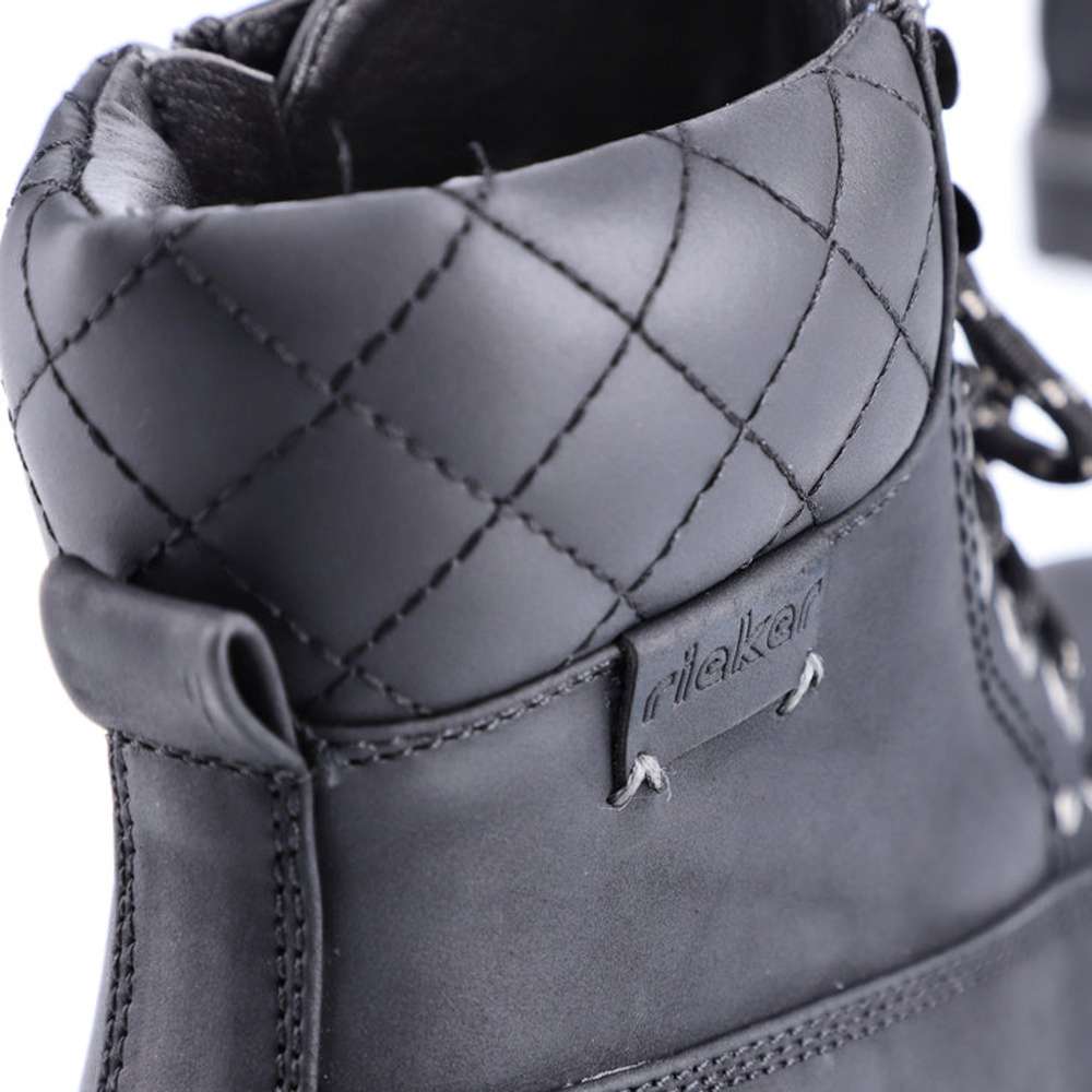 Dámská kotníková obuv značky RIEKER, která se bude hodit do Vašeho botníku zejména v podzimním období. Černý svršek je doplněn hrubým prošíváním, logem značky a v horní části je vyztužený pro pevnější umístění kotníku. Jednoduché obutí Vám zajistí zip na vnitřní straně a šněrování, abyste si chodidlo přizpůsobila podle svých preferencí. Pohodlná stélka je vyrobena z kvalitního materiálu, a bude s Vámi po celý den. Společně s kožešinovou podšívkou se nemusíte bát, že by Vám byla zima i v těch největších mrazech. Obuv si můžete vzít jak na procházky do parku, tak i na pochůzky do města či výlety. Tak nahoďte bundu a můžete vyrazit.