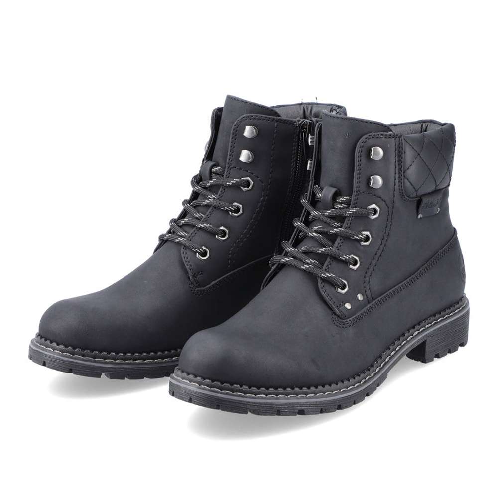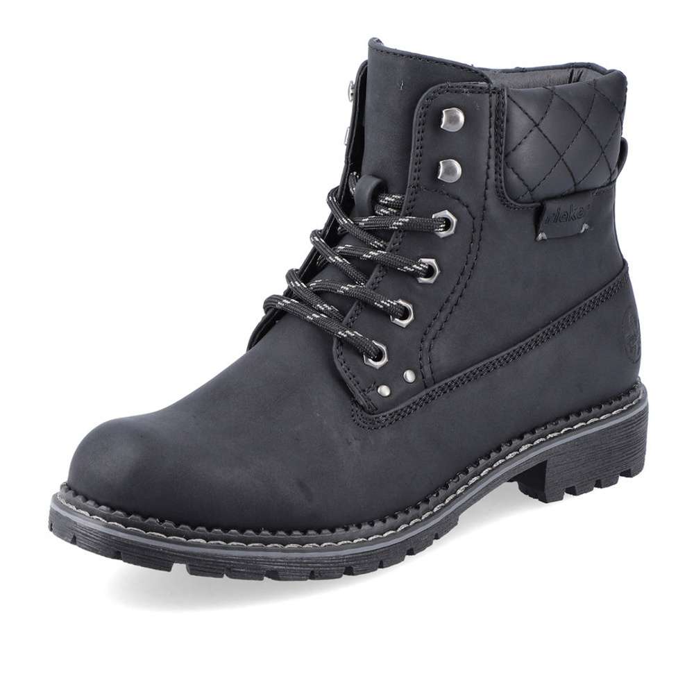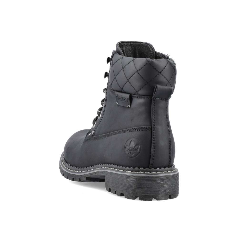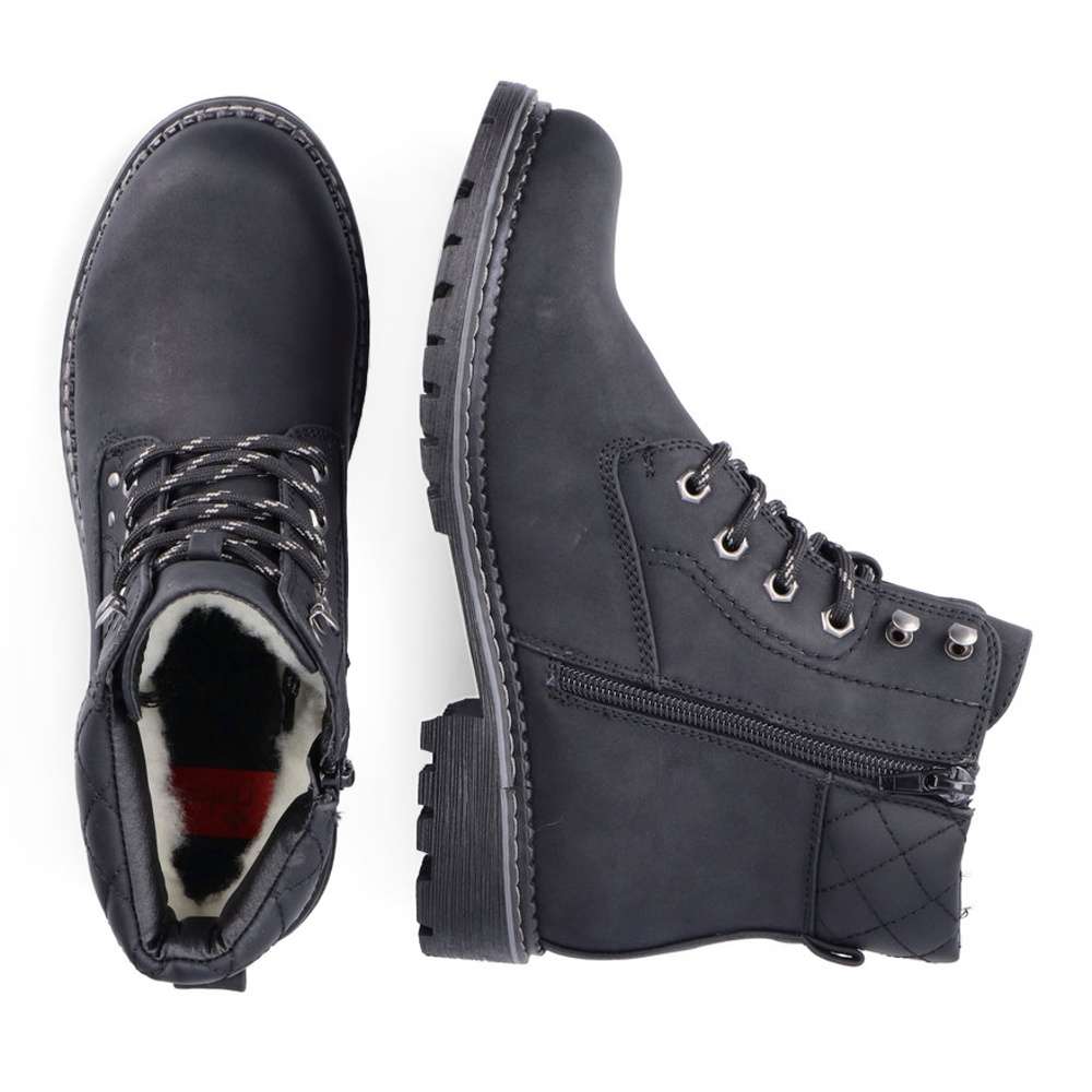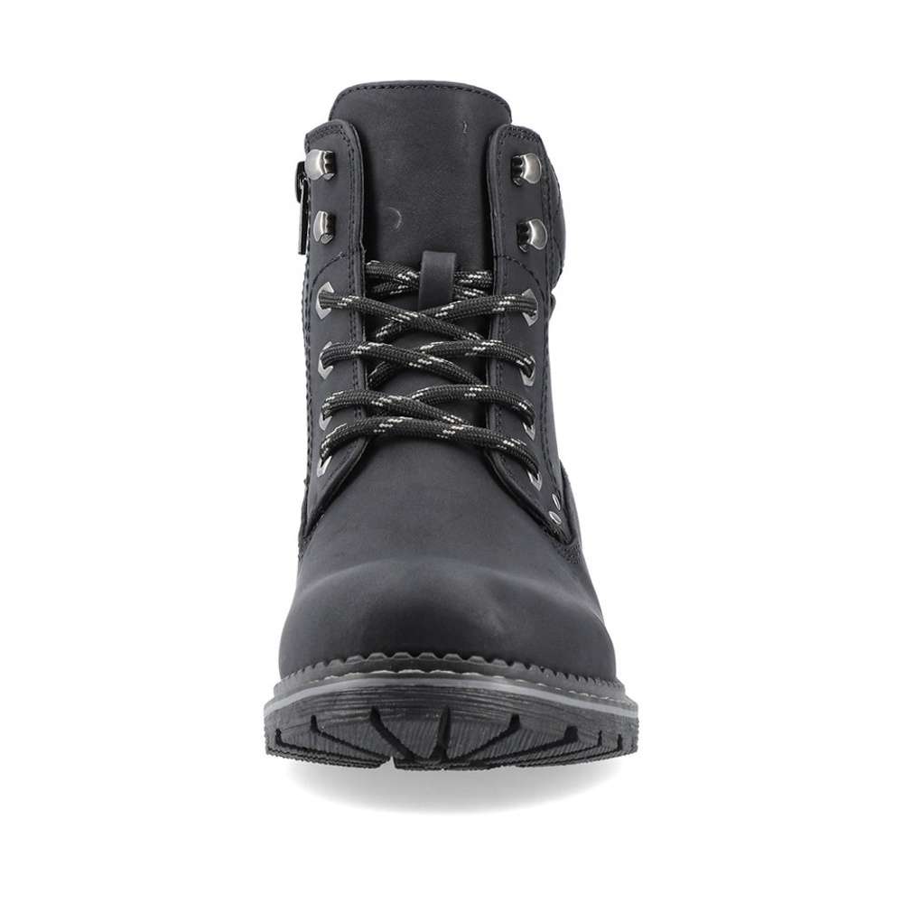 Dámská kotníková obuv značky RIEKER, která se bude hodit do Vašeho botníku zejména v podzimním období. Černý svršek je doplněn hrubým prošíváním, logem značky a v horní části je vyztužený pro pevnější umístění kotníku. Jednoduché obutí Vám zajistí zip na vnitřní straně a šněrování, abyste si chodidlo přizpůsobila podle svých preferencí. Pohodlná stélka je vyrobena z kvalitního materiálu, a bude s Vámi po celý den. Společně s kožešinovou podšívkou se nemusíte bát, že by Vám byla zima i v těch největších mrazech. Obuv si můžete vzít jak na procházky do parku, tak i na pochůzky do města či výlety. Tak nahoďte bundu a můžete vyrazit.
