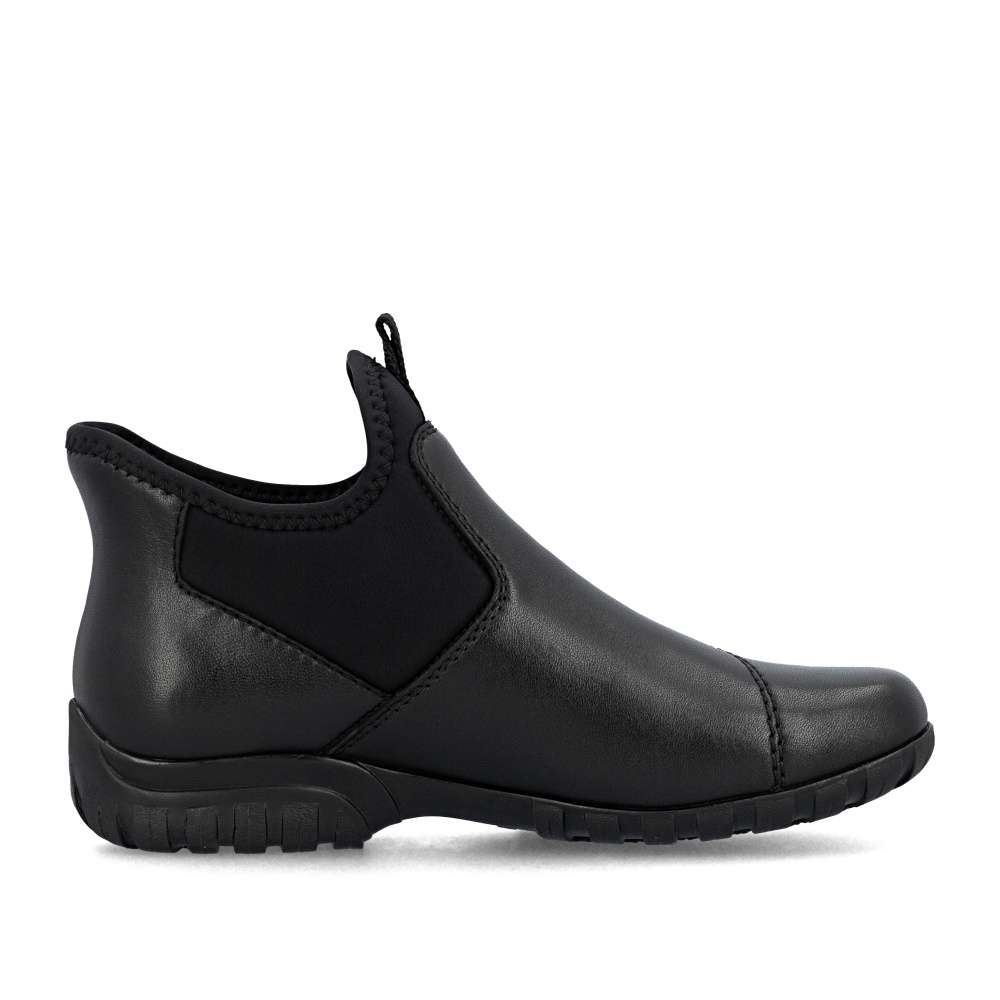 Detailní informace Kombinace černého koženého svršku a textilních částí, dekorovaná liniemi prošití dodává těmto kotníkovým botám RIEKER moderní a zároveň praktický vzhled. Díky nepromokavé vrstvě jsou ideální volbou i do nepříznivého počasí. Jednoduché nazutí zajišťuje pružný materiál spolu s tvarově stabilní patní částí, která zajistí rychlé vklouznutí do vyjímatelné stélky a příjemné podšívky těchto bot. Komfort každým krokem zajistí podešev s technologií tlumení nárazů. Spolehlivá obuv pro každý den, která nabízí komfort a nadčasový design pro snadné kombinování s oblečením.
