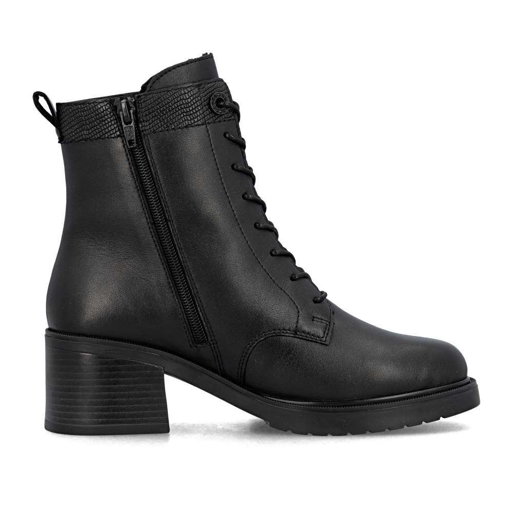 Dámské kotníkové boty RIEKER nabízí spojení nadčasového stylu a pohodlí v příjemném černém odstínu. Kožený svršek zdobí jemné prošívání, logo značky a atraktivní detail vzoru lemující horní část, který podtrhuje celkový design. Praktický boční zip usnadní obutí a šněrováním si boty upravíte k dokonalému pohodlí, zatímco měkká zateplená podšívka udrží vaše nohy v teple i během chladných dnů. Komfort každým krokem poskytne nárazy tlumící podešev se širokým podpatkem pro zajištění stability. Díky svému univerzálnímu vzhledu se tyto boty stanou vaším spolehlivým partnerem pro každodenní nošení. Technologie: Antistress – díky čtyřem antistresovým vlastnostem – lehkosti, pružnosti, prostornosti a vynikající absorpci nárazů – vám boty RIEKER nabídnou komfortnější chůzi.