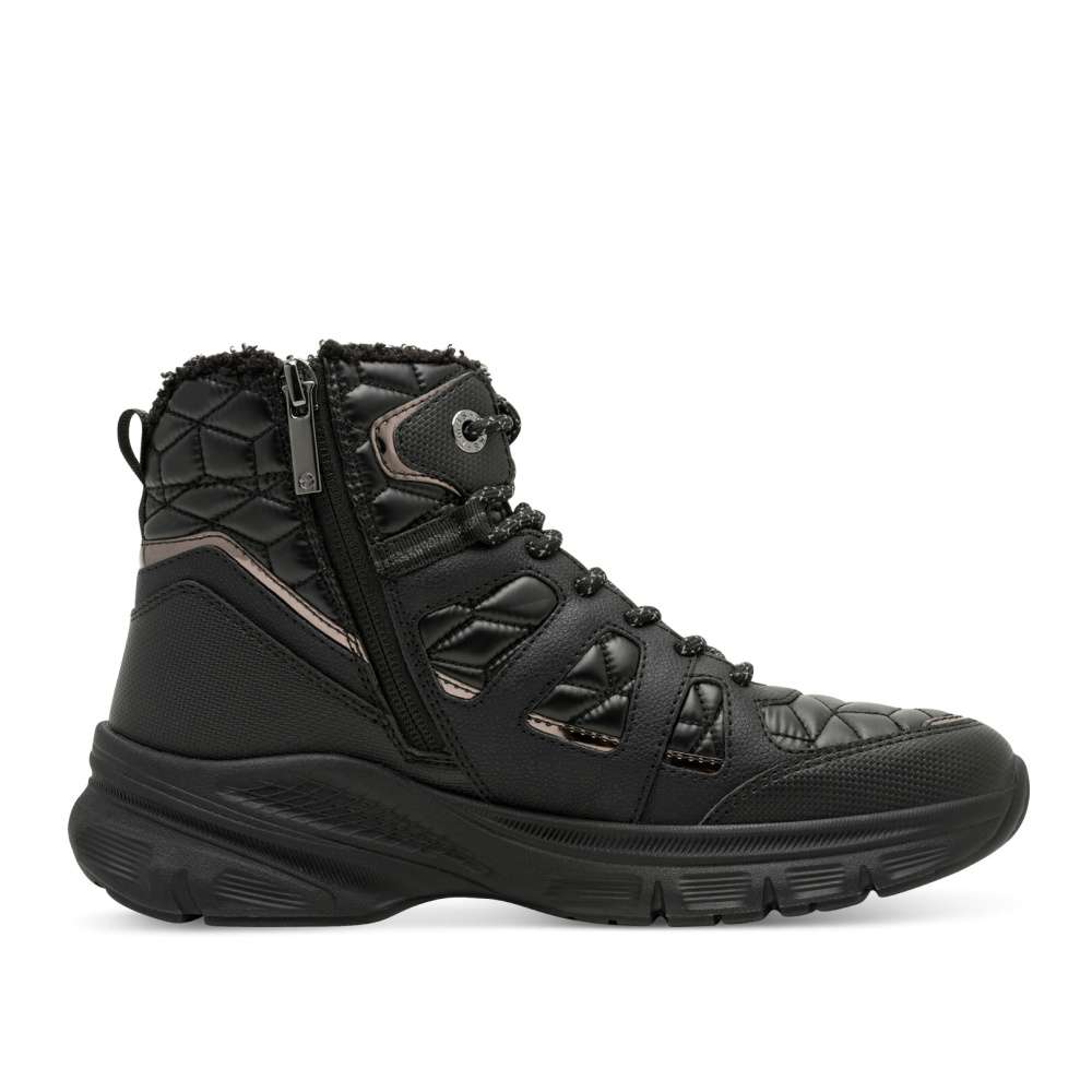 Detailní informace Tyto černé sportovní boty Tamaris v sobě spojují moderní ženský vzhled a dokonalý komfort, který oceníte při každém kroku. Už na první pohled zaujmou svým designem, svršek zdobený efektním prošitím a jemnými lesklými liniemi dodává botám šmrnc, díky kterému se stanou nepřehlédnutelnou součástí vašeho outfitu. Praktičnost je tu dokonale promyšlená. Šněrování v kombinaci s bočním zipem vám usnadní nazouvání a zároveň se postará o to, aby boty perfektně padly na každou nohu. Uvnitř na vás čeká měkká stélka a hřejivá podšívka, které vám dopřejí pocit pohodlí i během dlouhých dnů, kdy jste neustále v pohybu. Nezapomínejme ani na detaily, které dělají rozdíl – stabilní podešev nejen podtrhuje trendy vzhled, ale zajistí jistotu každým krokem. Tyto boty nejsou jen obyčejnou obuví – jsou módním vyjádřením vaší osobnosti. Dodají vašemu stylu moderní akcent a zajistí, že se budete cítit sebevědomě a pohodlně, ať už se vydáte kamkoliv – do práce, na procházku městem nebo setkání s přáteli. Tyto kotníkové boty Tamaris jsou spojením trendů, kvality a pohodlí – a přesně proto vám ve vašem šatníku rozhodně nesmí chybět.