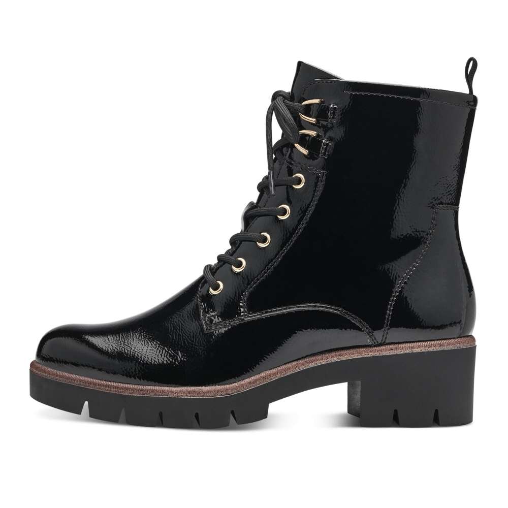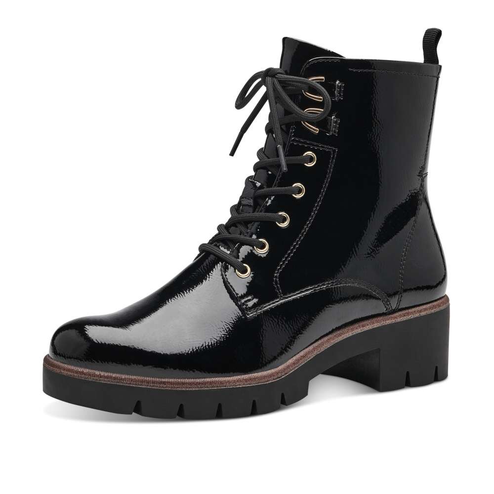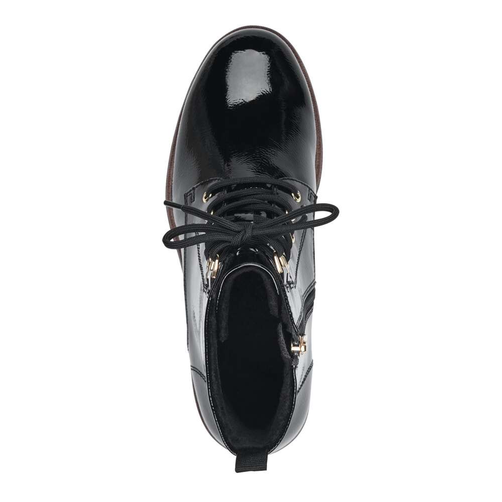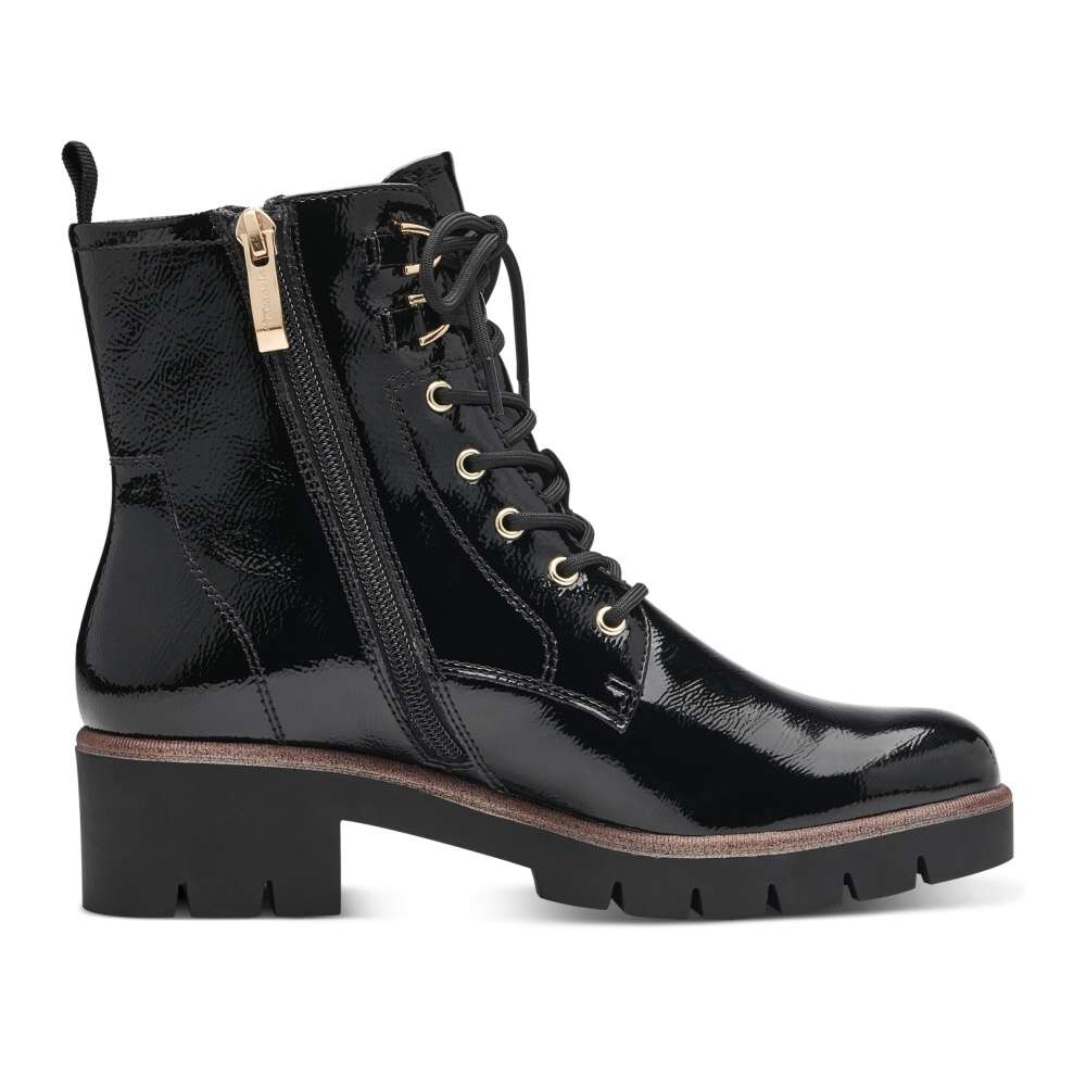 Detailní informace Tyto dámské kotníky značky TAMARIS Vás udělají nepřehlédnutelnou. Lesklý svršek je zdoben jemným prošíváním, zlatým uchycením tkaniček a poutkem ze zadní strany, které usnadní obutí. Pro přizpůsobení obuvi dle Vašich potřeb a snadné obutí poslouží šněrování a funkční zip na vnitřní straně obuvi. Komfort na každém kroku Vám garantuje paměťová stélka, teplejší podšívka a podešev s kontrastním lemováním doladí celkový vzhled obuvi k dokonalosti. Tímto pohodlným kouskem skvěle doplníte Váš outfit během všedních dnů.