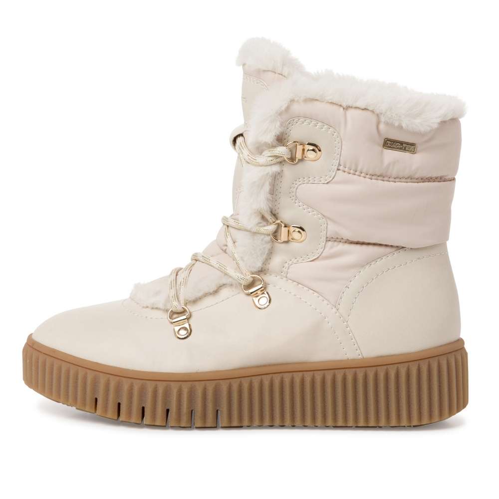 Detailní informace Tyto stylové sněhule značky Tamaris jsou ideální volbou do zasněženého dne. Efektní vzhled svršku je doplněn o speciální technologii DuoTex, díky čemuž budou Vaše nohy v suchu a bezpečí i při celodenním nošení. Pomocí zlatavých tkaniček si boty upravíte na nohu dle potřeby. Podšívka je vyteplená kožíškem, který vykukuje i mezi šněrováním a dodává modelu na své jedinečnosti. Pohodlí při chůzi Vám zajistí stélka se speciální technologií Touch-it. Stačí nazout, a můžete směle vykročit do zimního rána.