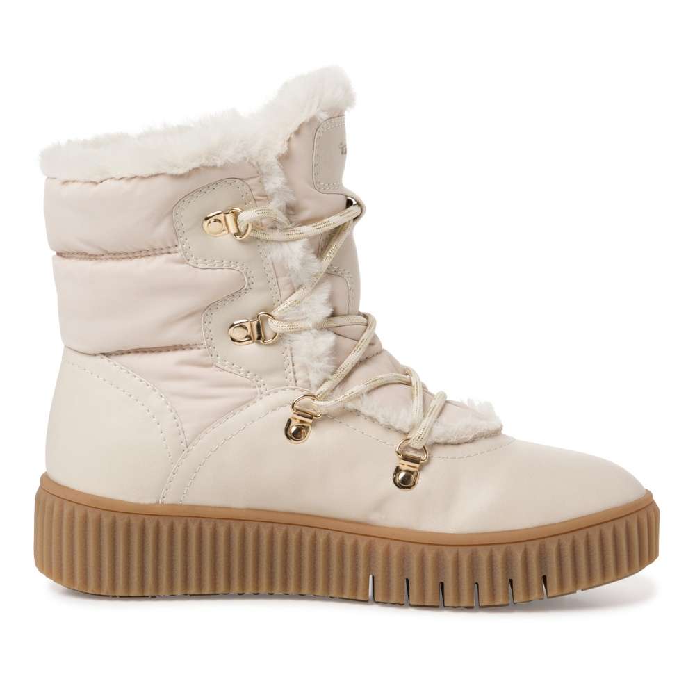 Tyto stylové sněhule značky Tamaris jsou ideální volbou do zasněženého dne. Efektní vzhled svršku je doplněn o speciální technologii DuoTex, díky čemuž budou Vaše nohy v suchu a bezpečí i při celodenním nošení. Pomocí zlatavých tkaniček si boty upravíte na nohu dle potřeby. Podšívka je vyteplená kožíškem, který vykukuje i mezi šněrováním a dodává modelu na své jedinečnosti. Pohodlí při chůzi Vám zajistí stélka se speciální technologií Touch-it. Stačí nazout, a můžete směle vykročit do zimního rána. Technologie: Touch-it – měkká stélka, která se dokonale přizpůsobí tvaru nohy, a díky tomu při nošení zajišťuje optimální pohodlí. DuoTex - obuv s membránou DUOtex je nepromokavá a přesto prodyšná. Díky ní jsou nohy v příjemném klimatu při dešti, ve větru i sněhu.