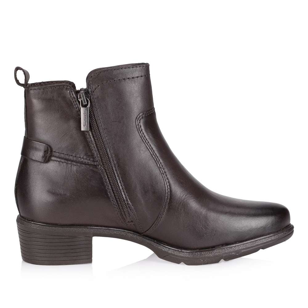 Detailní informace Elegantní kotník značky Tamaris vyroben přímo pro Váš styl. Svršek z hladké kůže, jemně zdoben prošitím, logem značky a zipem po obou stranách boty. Velkou výhodou obuvi je vyjímatelná stélka, kterou lze vyčistit, vyvětrat nebo vyměnit. Stylová podešev s decentním podpatkem o výšce 4 cm zaručí komfort a pohodlí na každém kroku. K obuvi dokonale doladíte jeansy nebo i sukni.